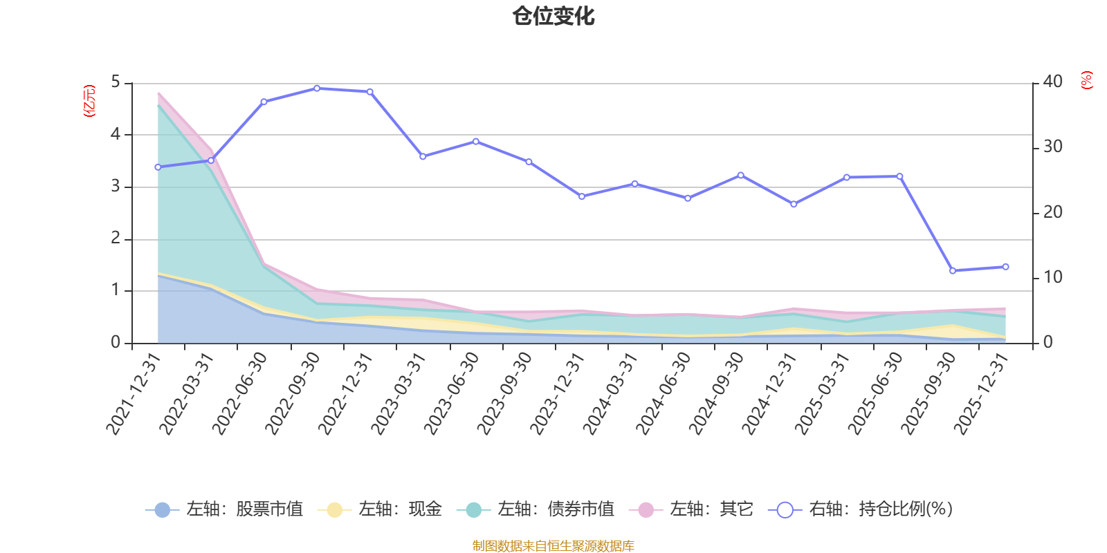据定期报告数据统计,近三年平均股票仓位为23.18%,同类平均为19.2%。2022年三季度末基金达到39.18%的最高仓位,2025年三季度末最低,为11.14%。