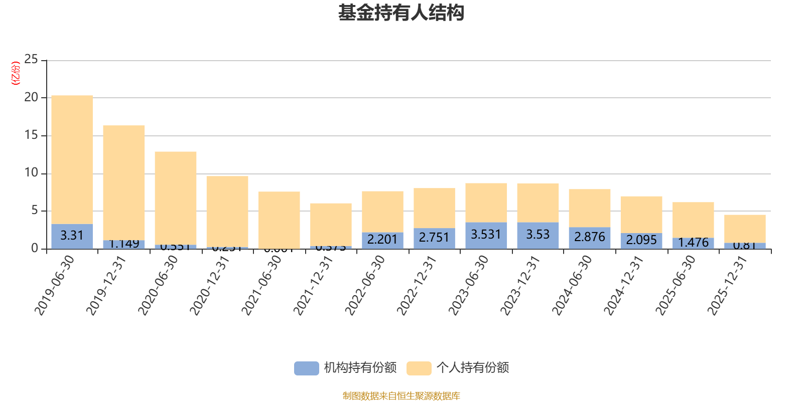 截至2025年12月31日,基金持有人共计1.85万户,合计持有4.5亿份。其中管理人员工持有23.37万份,占比0.05%,机构持有份额占比17.98%,个人投资者占比82.02%。