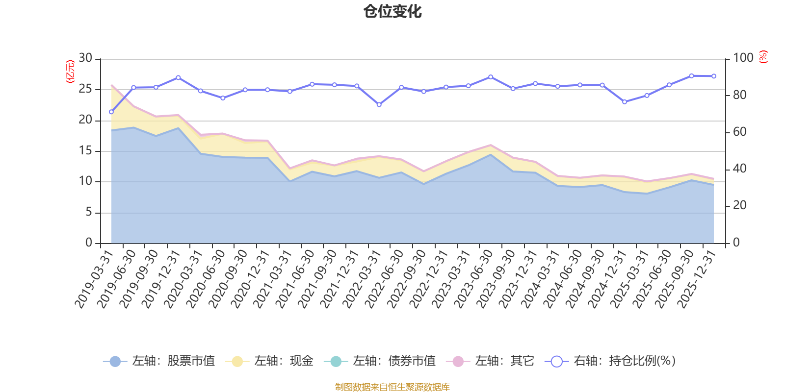 据定期报告数据统计,近三年平均股票仓位为85.56%,同类平均为72.57%。2025年三季度末基金达到90.75%的最高仓位,2019年一季度末最低,为71.24%。