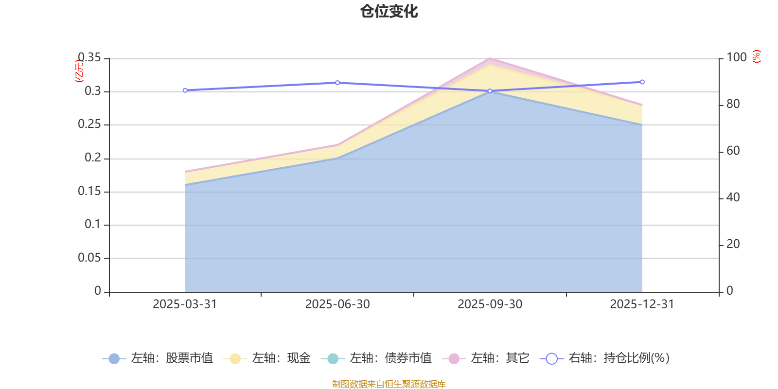 据定期报告数据统计,成立以来平均股票仓位为87.95%,同类平均为86.9%。2025年末基金达到89.89%的最高仓位,2025年三季度末最低,为86.03%。
