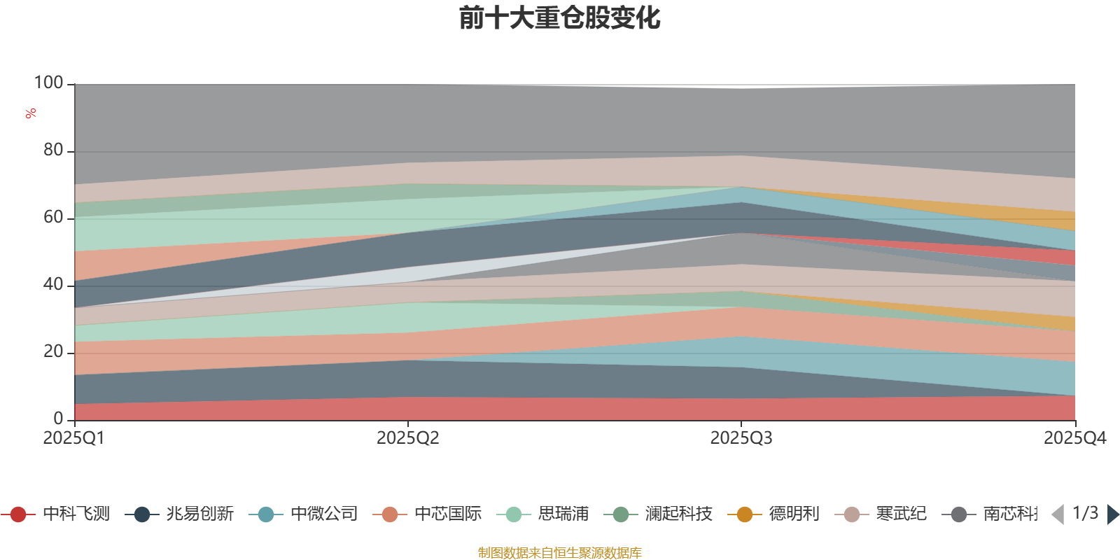该基金持股集中度较高。截至2025年末,基金十大重仓股分别是寒武纪、中微公司、海光信息、中芯国际、中科飞测、香农芯创、华虹公司、盛科通信、通富微电、德明利。