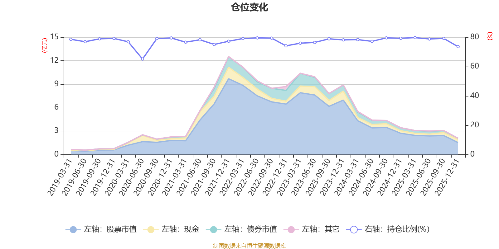 据定期报告数据统计,近三年平均股票仓位为78.01%,同类平均为72.57%。2025年一季度末基金达到79.8%的最高仓位,2020年上半年末最低,为65.2%。