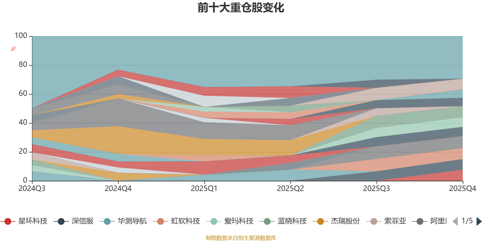 该基金持股集中度较高。截至2025年末,基金十大重仓股分别是阿里巴巴-W、金蝶国际、虹软科技、星环科技、腾讯控股、深信服、达梦数据、金山办公、合合信息、范式智能。