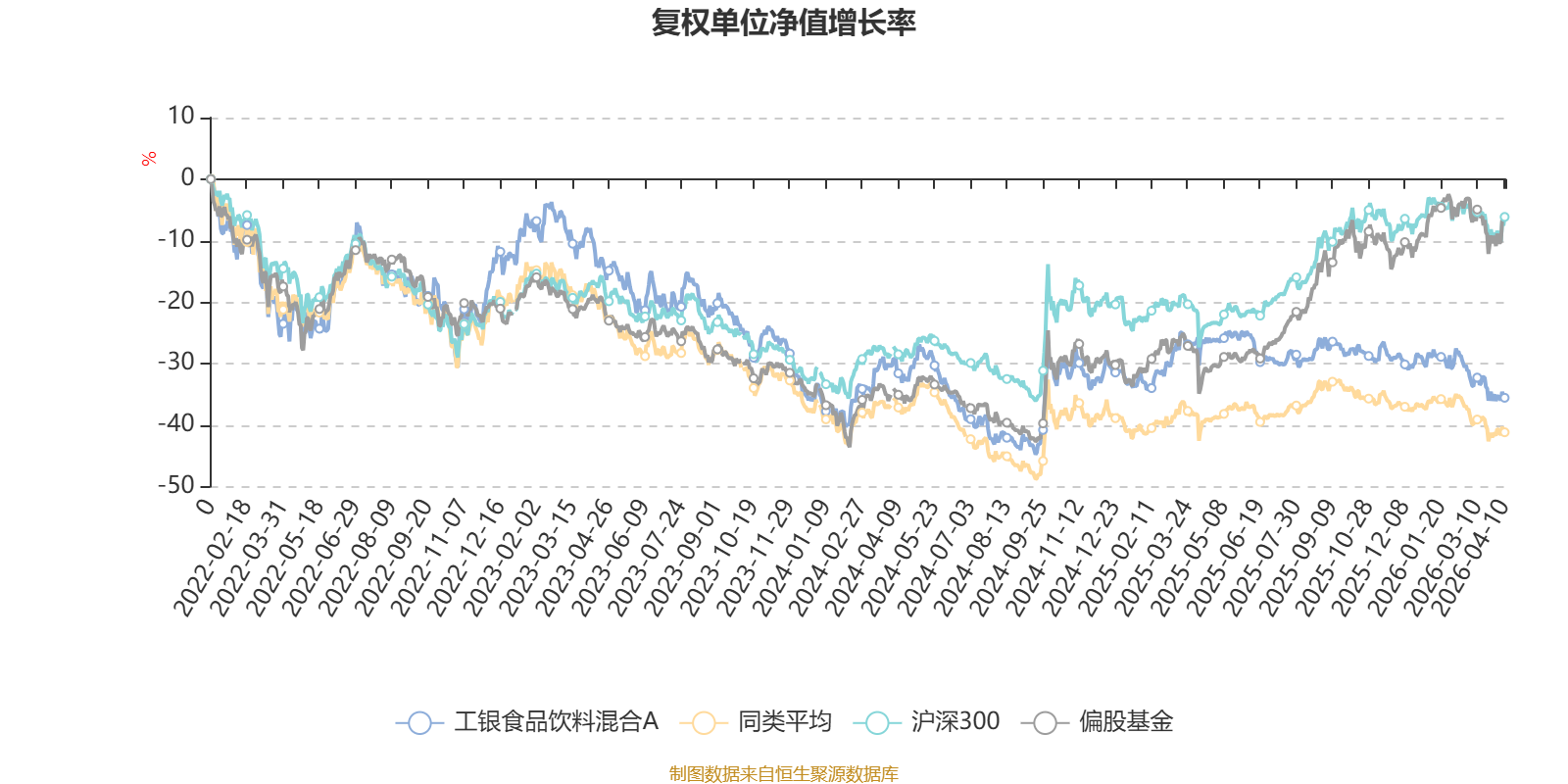 截至4月10日,工银食品饮料混合A近三个月复权单位净值增长率为-9.56%,位于同类可比基金58/85;近半年复权单位净值增长率为-11.18%,位于同类可比基金44/85;近一年复权单位净值增长率为-12.64%,位于同类可比基金77/85;近三年复权单位净值增长率为-28.08%,位于同类可比基金54/76。