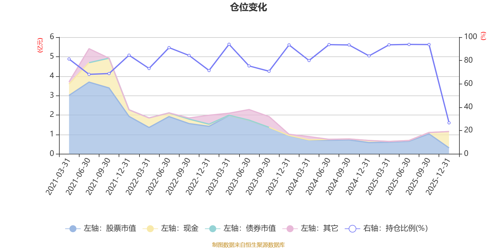 据定期报告数据统计,近三年平均股票仓位为82.69%,同类平均为86.9%。2023年一季度末基金达到93.95%的最高仓位,2025年末最低,为26.64%。