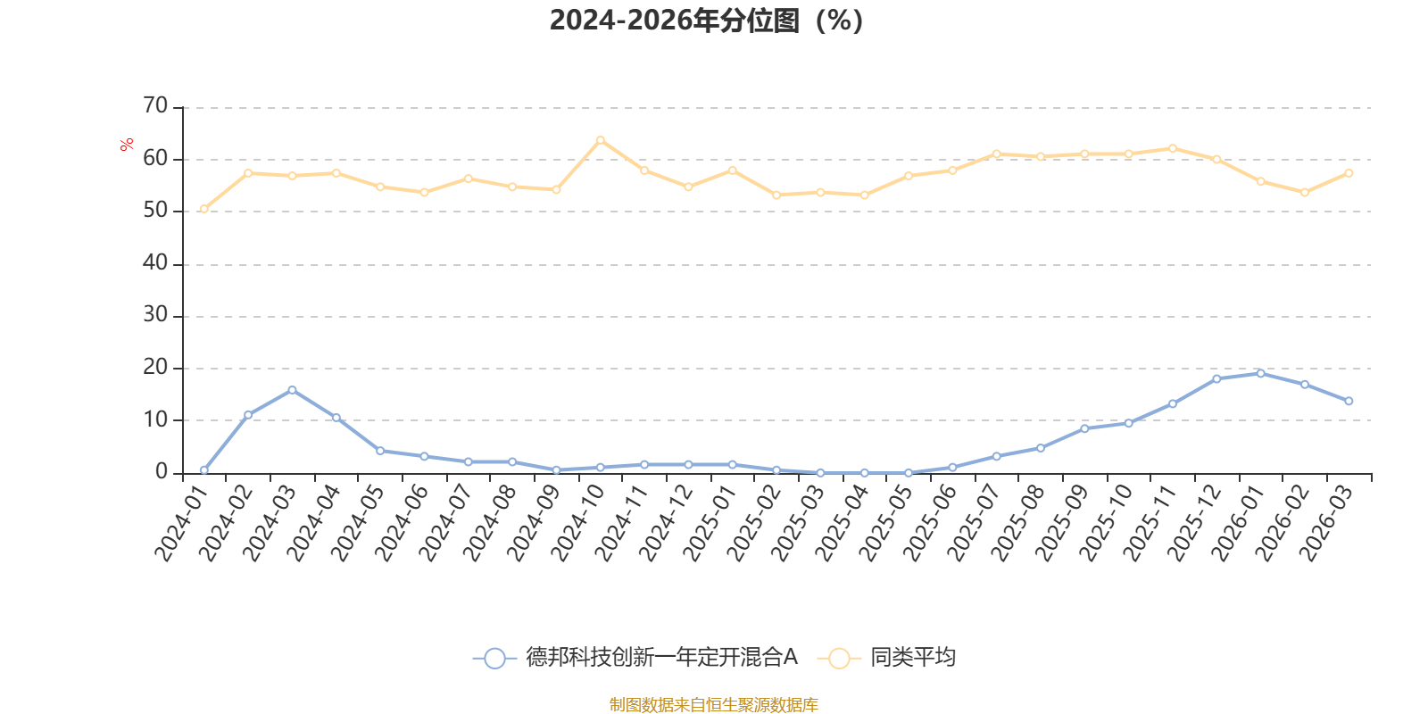 通过所选区间该基金净值增长率分位图,可以观察该基金与同类基金业绩比较情况。图为坐标原点到区间内某时点的净值增长率在同类基金中的分位数。