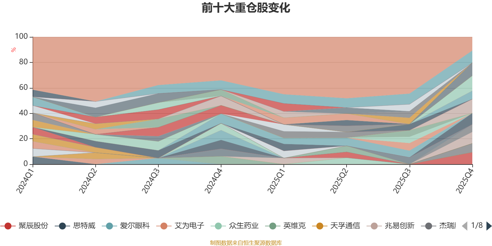 截至2025年末,基金十大重仓股分别是合合信息、菲利华、万兴科技、胜宏科技、聚辰股份、长川科技、寒武纪、杰瑞股份、浪潮信息、精测电子。