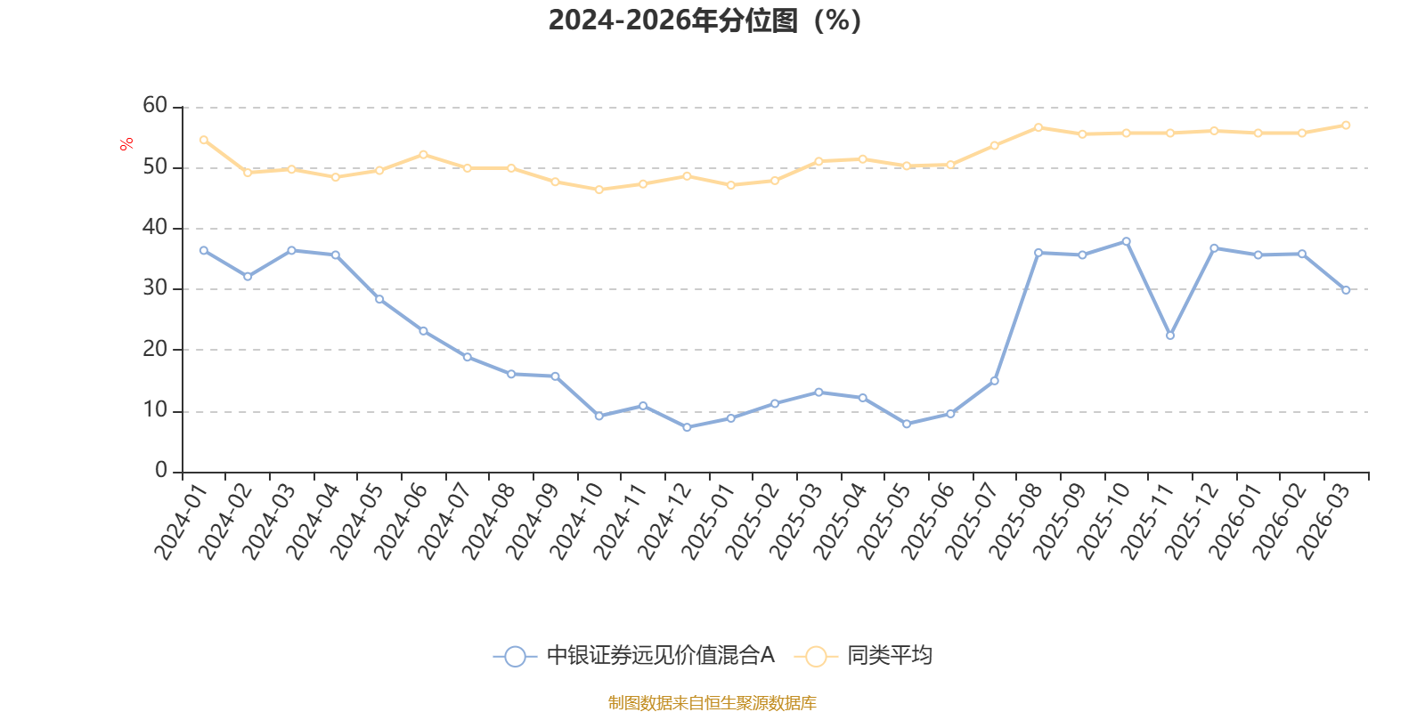 通过所选区间该基金净值增长率分位图,可以观察该基金与同类基金业绩比较情况。图为坐标原点到区间内某时点的净值增长率在同类基金中的分位数。