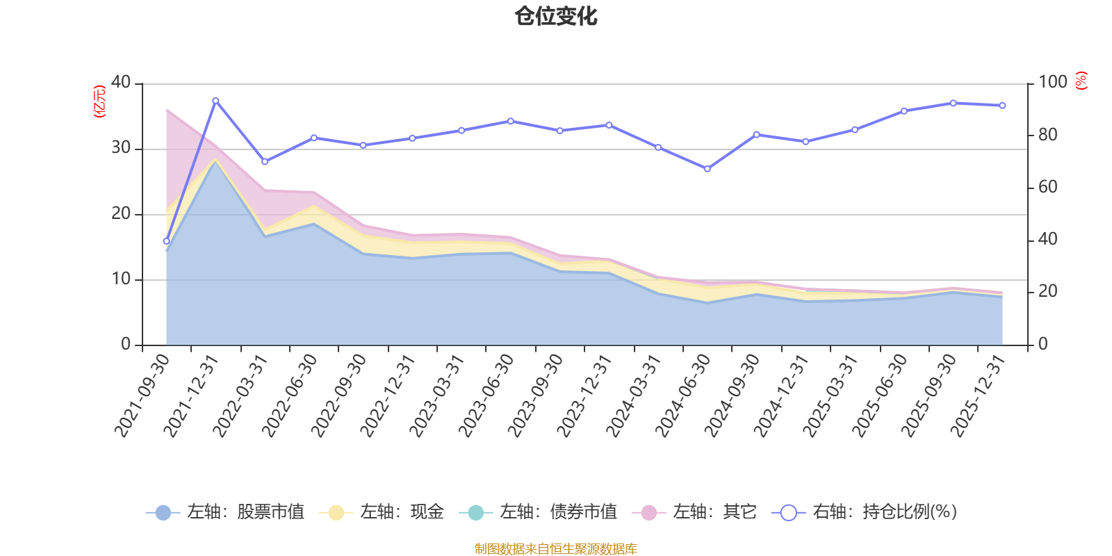 据定期报告数据统计,近三年平均股票仓位为82.53%,同类平均为86.12%。2021年末基金达到93.4%的最高仓位,2021年三季度末最低,为39.73%。