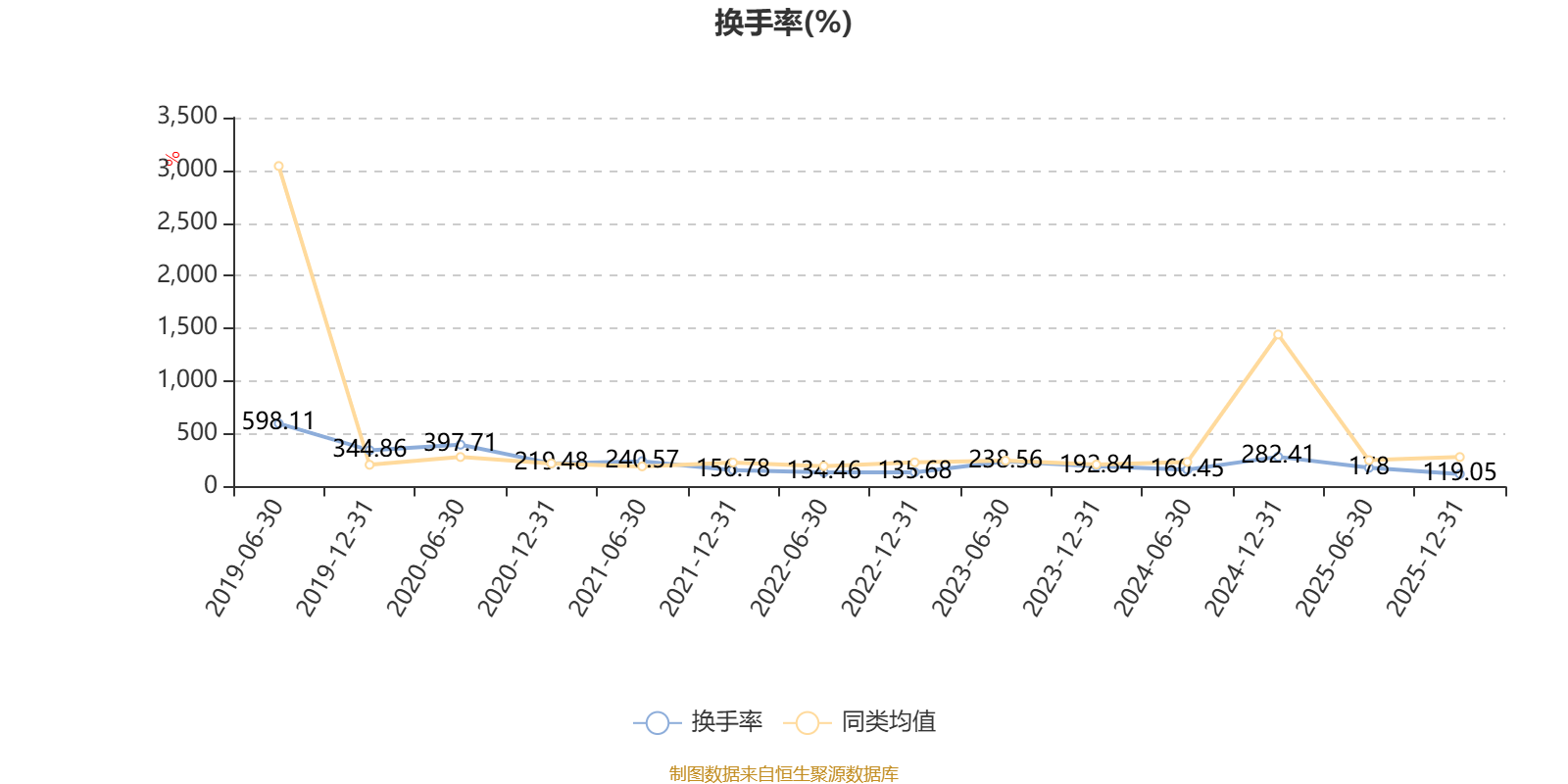 截至2025年12月31日,基金最近一年换手率约298.63%,持续4年低于同类均值。