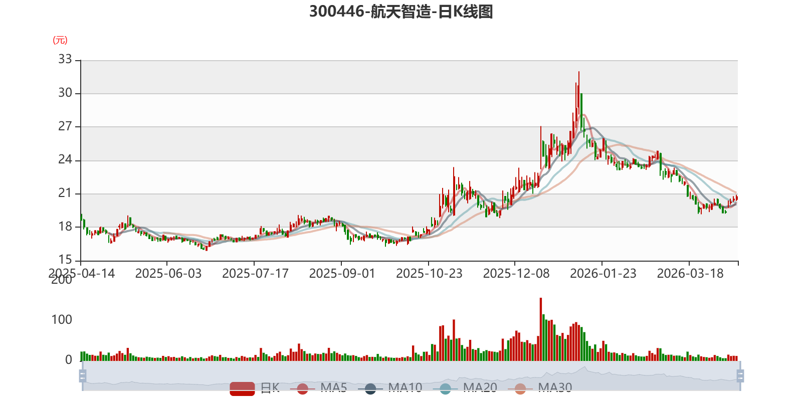 中证智能财讯航天智造(300446)4月13日晚间披露业绩预告,预计2026年一季度归母净利润1.26亿元至1.49亿元,同比下降20%-32%;扣非净利润预计1.15亿元-1.42亿元,同比下降20%-35%。以4月13日收盘价计算,航天智造目前市盈率(TTM)约为20.77倍-21.33倍,市净率(LF)约2.97倍,市销率(TTM)约1.95倍。