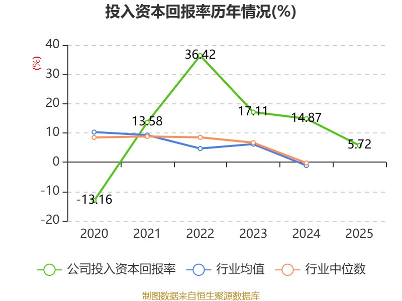 数据显示,2025年公司加权平均净资产收益率为6.23%,较上年同期下降10.54个百分点。公司2025年投入资本回报率为5.72%,较上年同期下降9.15个百分点。