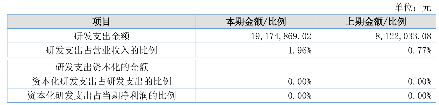 2025年全年,公司研发投入金额为1917.49万元,同比增长136.08%;研发投入占营业收入比例为1.96%,相比上年同期上升1.19个百分点。此外,公司全年研发投入资本化率为0%。