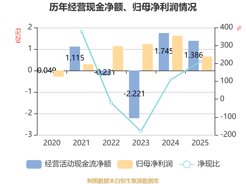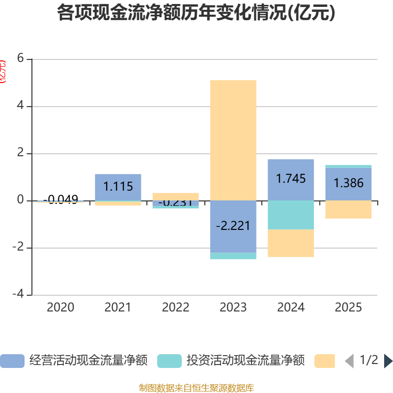 截至2025年,公司经营活动现金流净额为1.39亿元,同比下降20.57%;筹资活动现金流净额-7666.05万元,同比增加3977.17万元;投资活动现金流净额1173.18万元,上年同期为-1.24亿元。