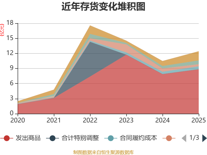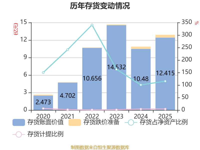 从存货变动来看,截至2025年末,公司存货账面价值为12.42亿元,占净资产的115.3%,较上年末增加1.94亿元。其中,存货跌价准备为4725.28万元,计提比例为3.67%。