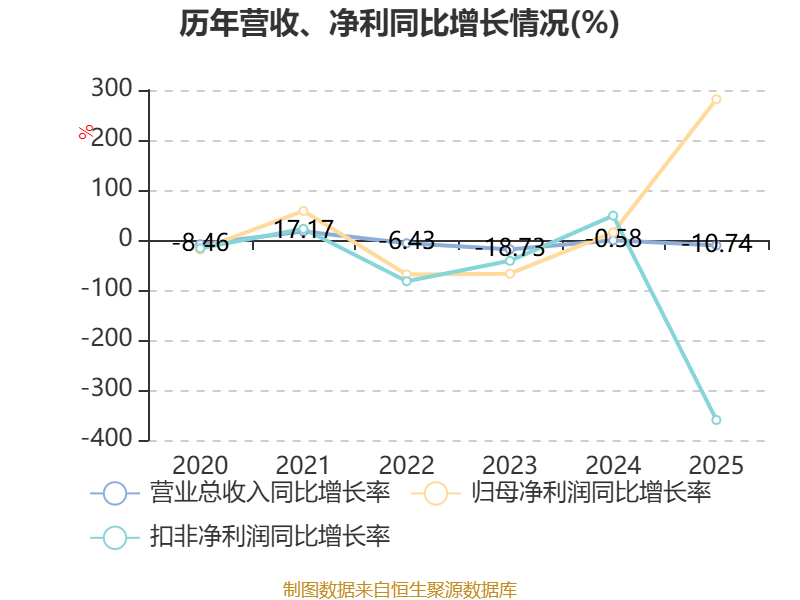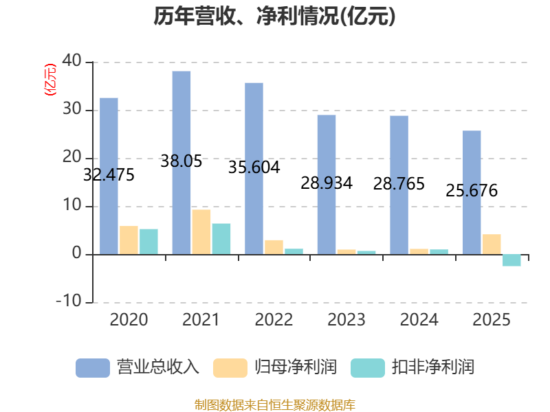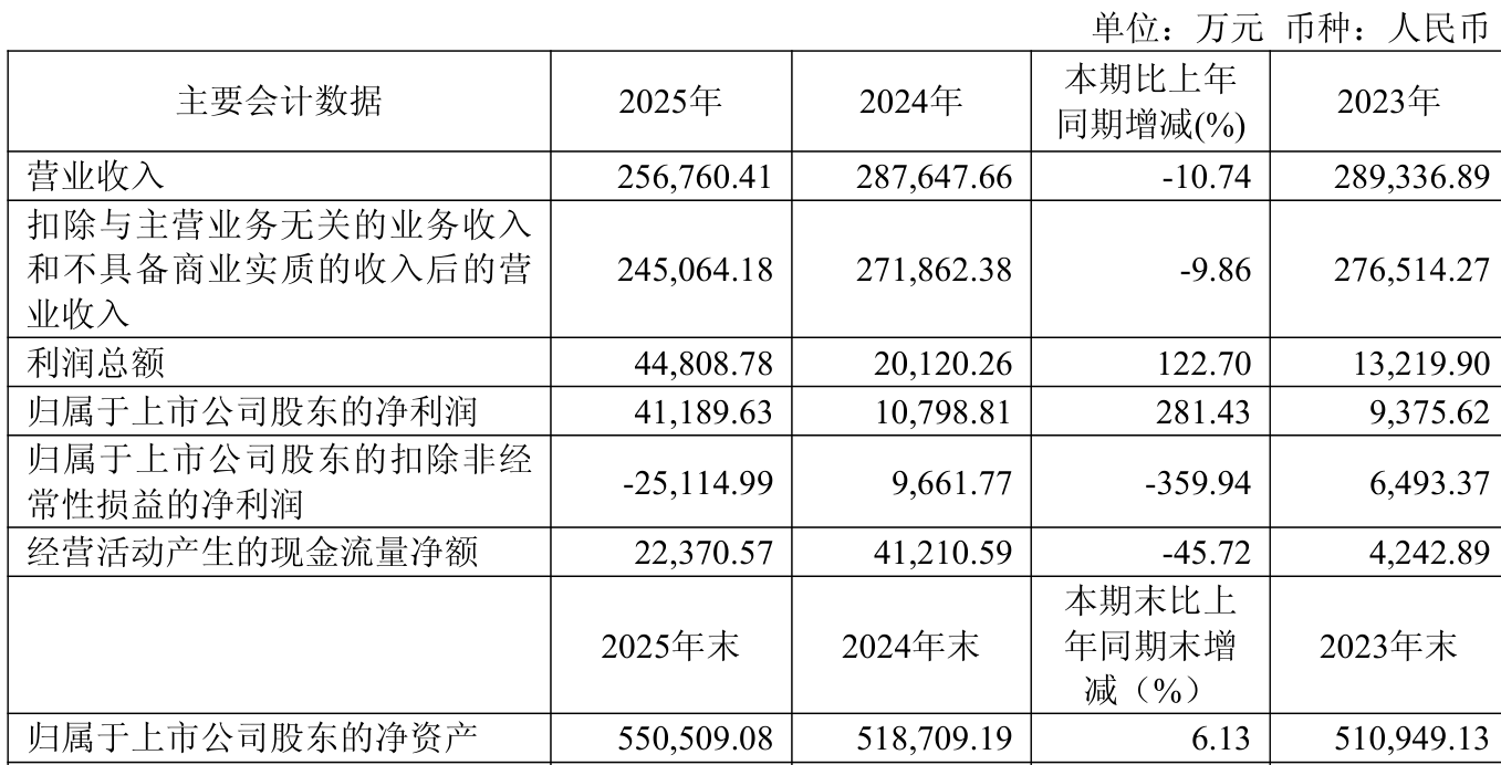 中证智能财讯尖峰集团(600668)4月14日披露2025年年度报告。2025年,公司实现营业总收入25.68亿元,同比下降10.74%;归母净利润4.12亿元,同比增长281.43%;扣非净利润亏损2.51亿元,上年同期盈利9661.77万元;经营活动产生的现金流量净额为2.24亿元,同比下降45.72%;报告期内,尖峰集团基本每股收益为0.9982元,加权平均净资产收益率为7.69%。公司2025年度分配预案为:拟向全体股东每10股派现1元(含税)。