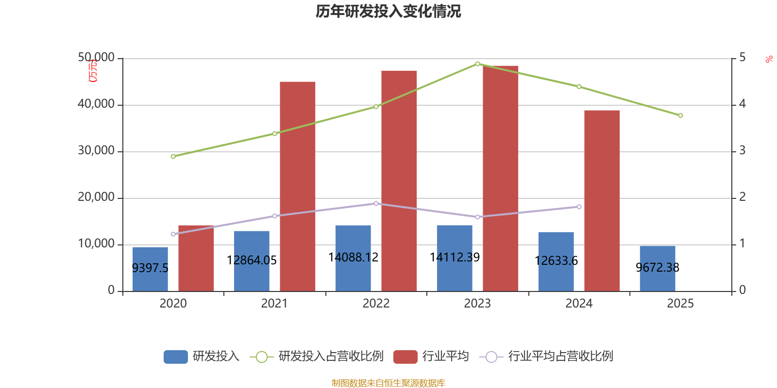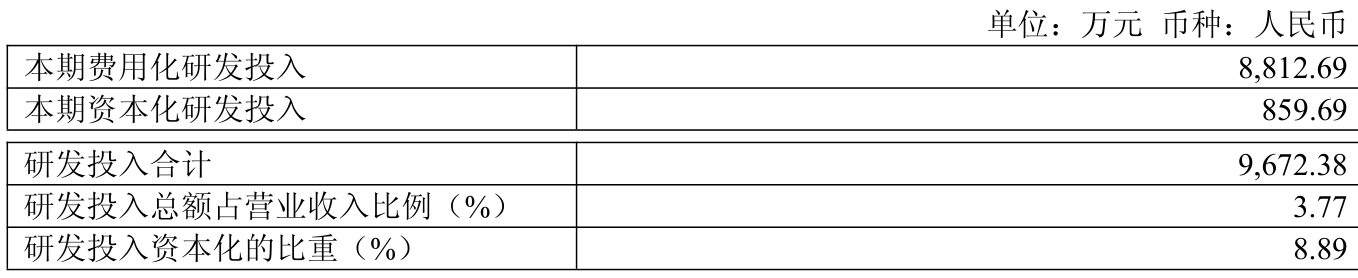 2025年全年,公司研发投入金额为9672.38万元,同比下降23.44%;研发投入占营业收入比例为3.77%,相比上年同期下降0.62个百分点。此外,公司全年研发投入资本化率为8.89%。