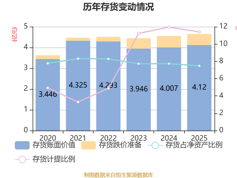 从存货变动来看,截至2025年末,公司存货账面价值为4.12亿元,占净资产的7.48%,较上年末增加1125.98万元。其中,存货跌价准备为5301.99万元,计提比例为11.4%。
