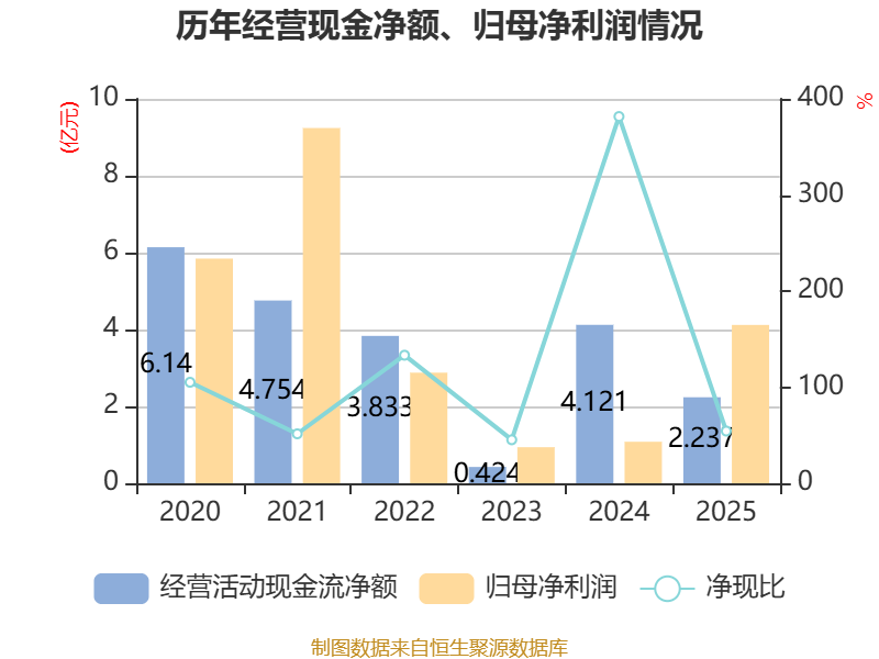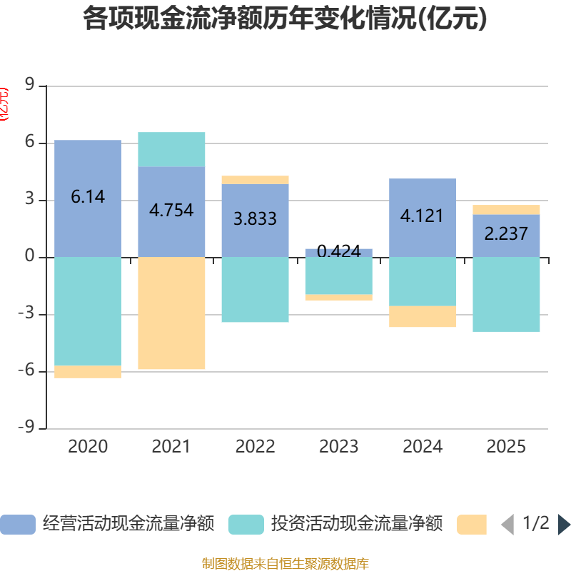 截至2025年,公司经营活动现金流净额为2.24亿元,同比下降45.72%;筹资活动现金流净额4983.68万元,同比增加1.6亿元;投资活动现金流净额-3.94亿元,上年同期为-2.58亿元。