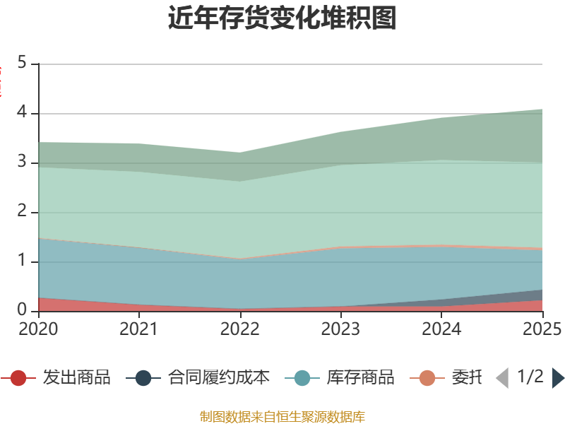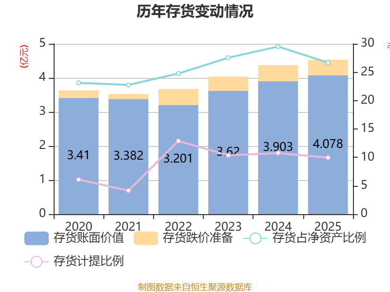 从存货变动来看,截至2025年末,公司存货账面价值为4.08亿元,占净资产的26.69%,较上年末增加1744.72万元。其中,存货跌价准备为4505.33万元,计提比例为9.95%。