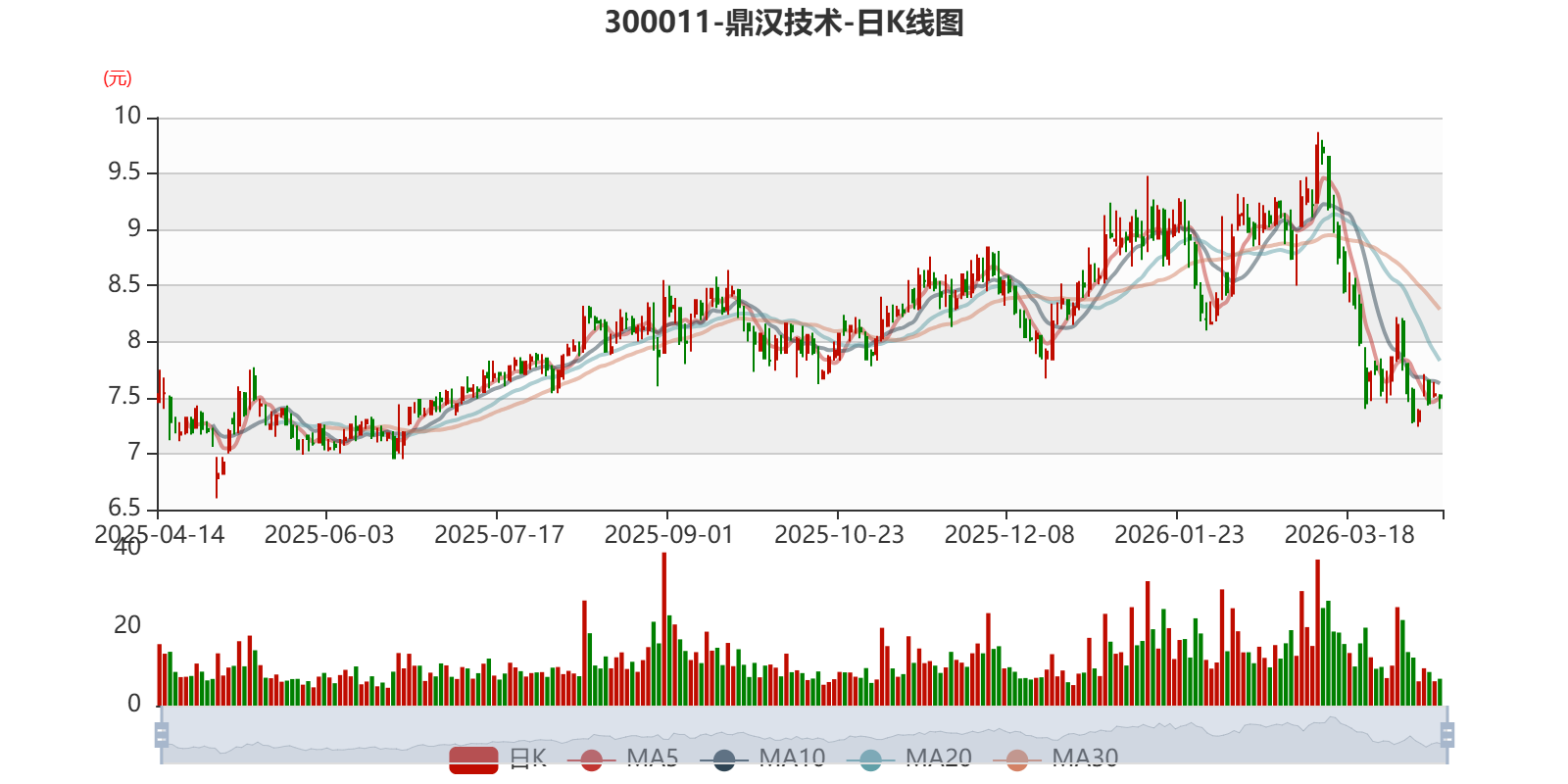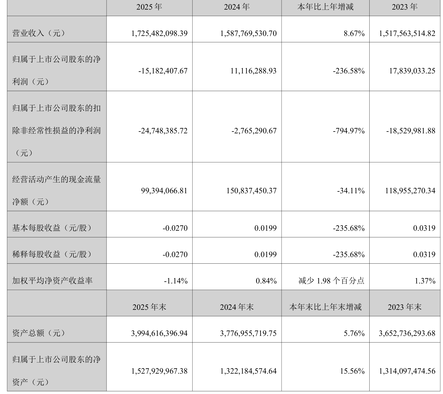 中证智能财讯鼎汉技术(300011)4月14日披露2025年年度报告。2025年,公司实现营业总收入17.25亿元,同比增长8.67%;归母净利润亏损1518.24万元,上年同期盈利1111.63万元;扣非净利润亏损2474.84万元,上年同期亏损276.53万元;经营活动产生的现金流量净额为9939.41万元,同比下降34.11%;报告期内,鼎汉技术基本每股收益为-0.027元,加权平均净资产收益率为-1.14%。