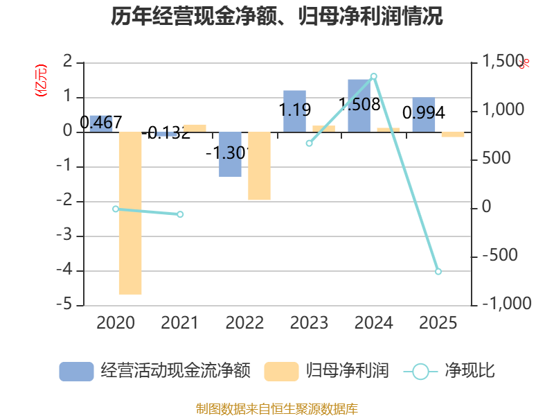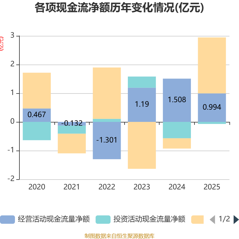 截至2025年,公司经营活动现金流净额为9939.41万元,同比下降34.11%;筹资活动现金流净额1.95亿元,同比增加2.31亿元;投资活动现金流净额-723.69万元,上年同期为-5714.99万元。
