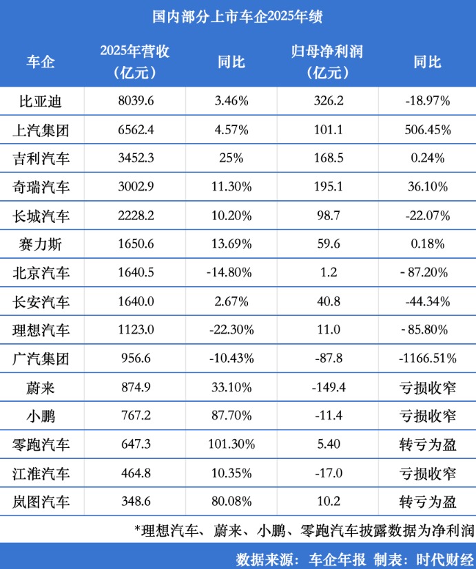 此外,2025年,广汽集团、理想汽车录得营收、利润双双下滑;蔚来、小鹏尽管实现单季盈利,但还未走出全年亏损。