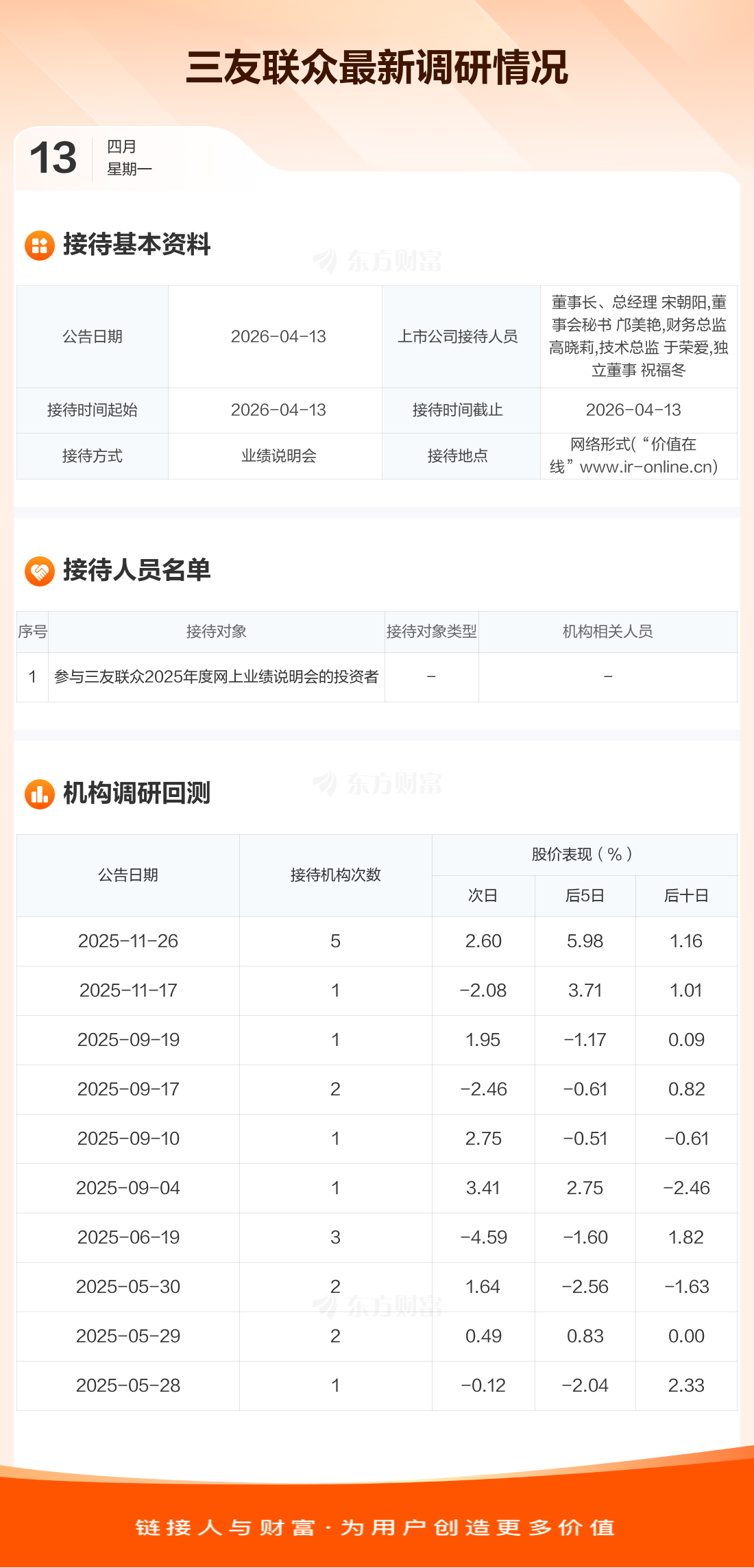 三友联众4月13日公告称,4月13日接待参与三友联众2025年度网上业绩说明会的投资者等1家机构调研。接待人员包括董事长、总经理 宋朝阳,董事会秘书 邝美艳,财务总监 高晓莉,技术总监 于荣爱,独立董事 祝福冬。