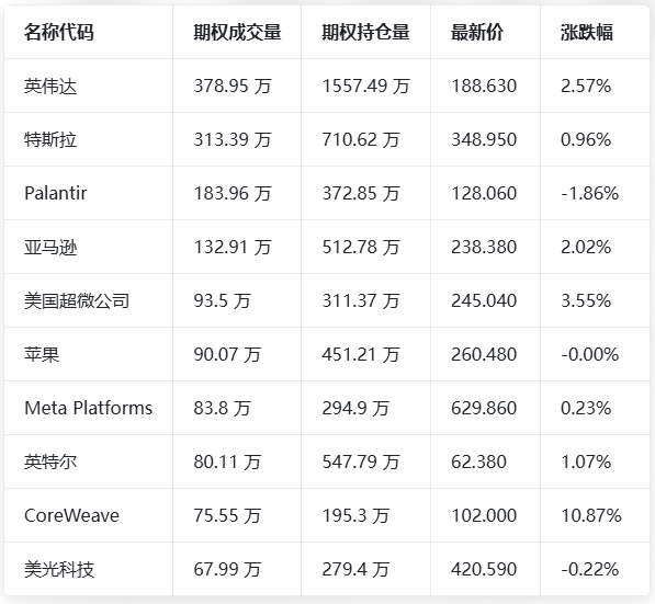 期权成交量前10的股票中,英特尔的看跌/看涨成交量比最高,达到0.99。英特尔加入马斯克Terafab AI芯片项目并与谷歌深化合作。