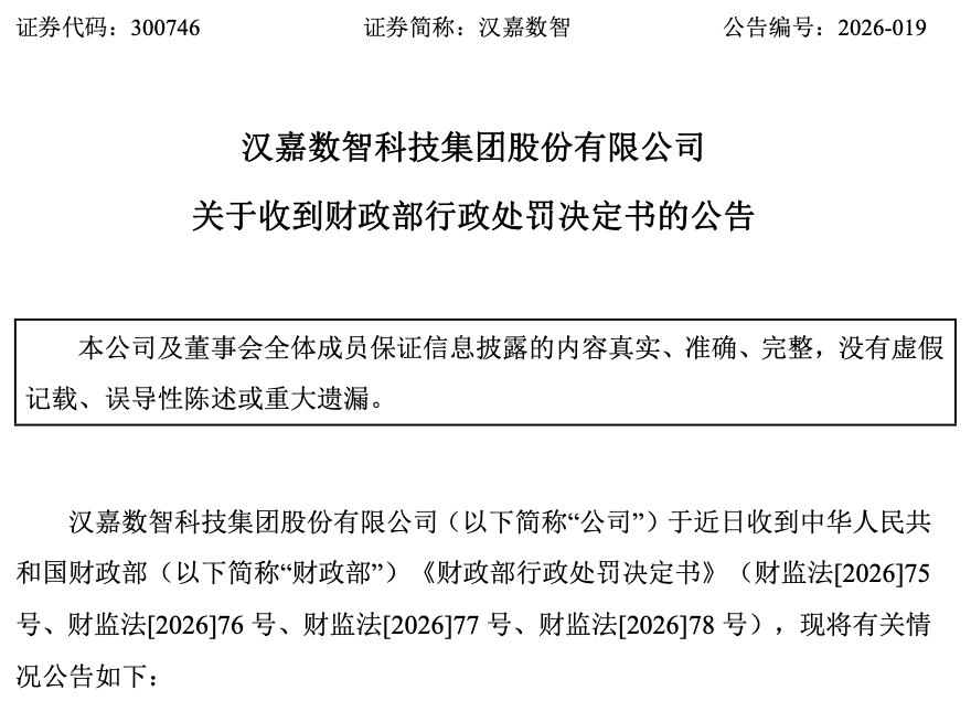 4月13日,汉嘉数智(300746)公告称,公司于近日收到中华人民共和国财政部(以下简称“财政部”)《财政部行政处罚决定书》。