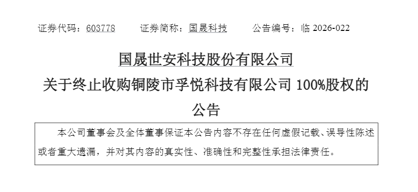 4月13日晚间,国晟科技发布公告称,决定终止收购铜陵市孚悦科技有限公司100%股权。