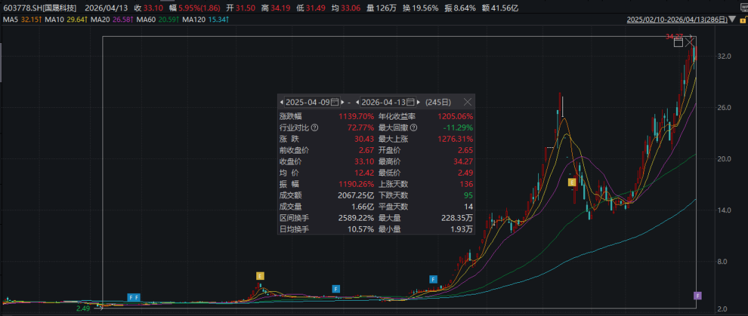 值得一提的是,国晟科技近一年来涨幅巨大,Wind统计数据显示,自去年4月9日以来,该股累计涨幅超过1100%。