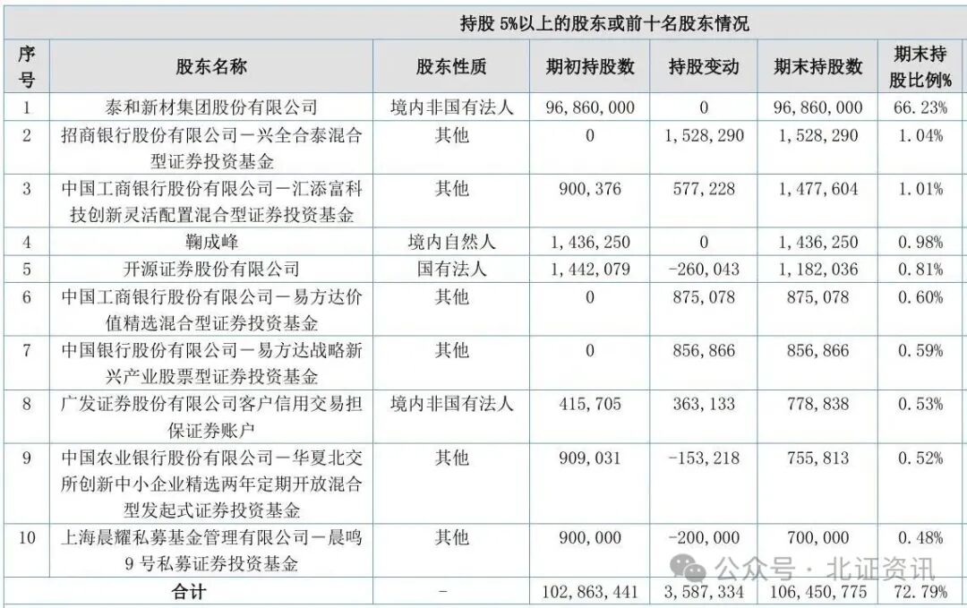 值得一提的是,今年一季度,民士达获得多家公募基金加仓。其中,招商银行股份有限公司-兴全合泰混合型证券投资基金增持152.829万股,占民士达总股本的1.04%,新晋成为公司第二大股东。