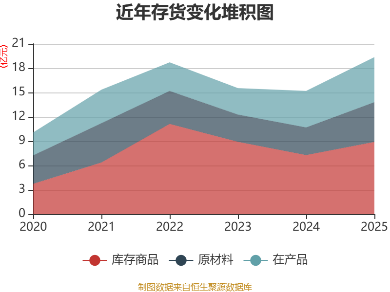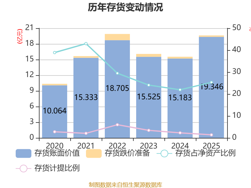 从存货变动来看,截至2025年末,公司存货账面价值为19.35亿元,占净资产的25.31%,较上年末增加4.16亿元。其中,存货跌价准备为2711.8万元,计提比例为1.38%。