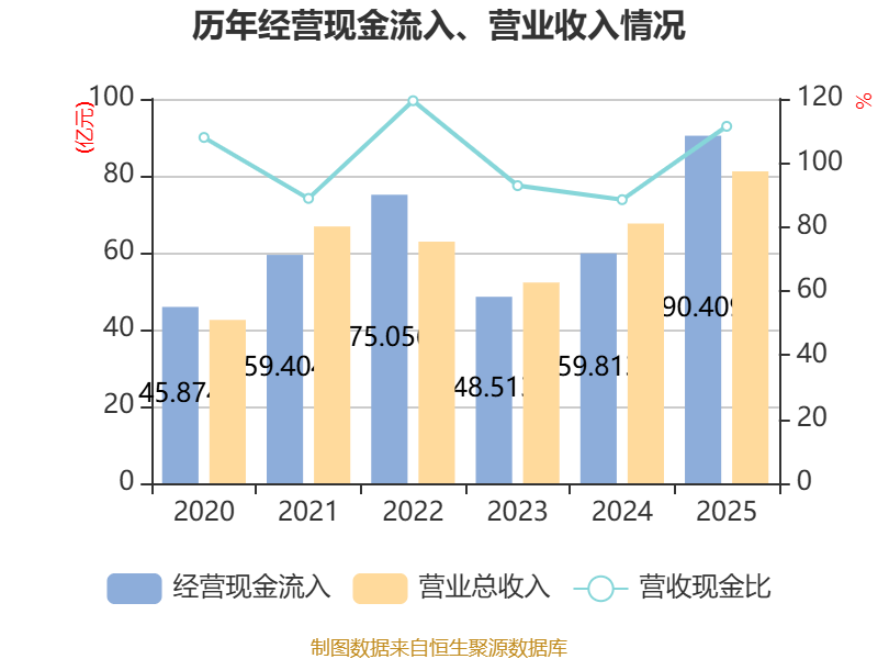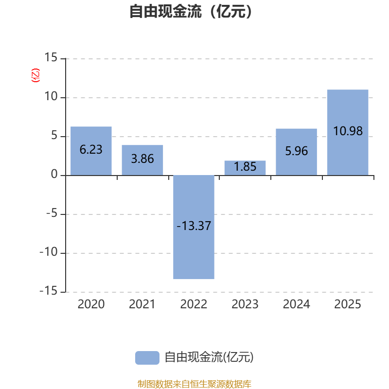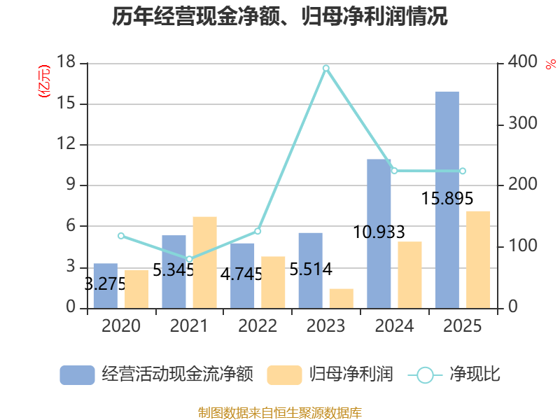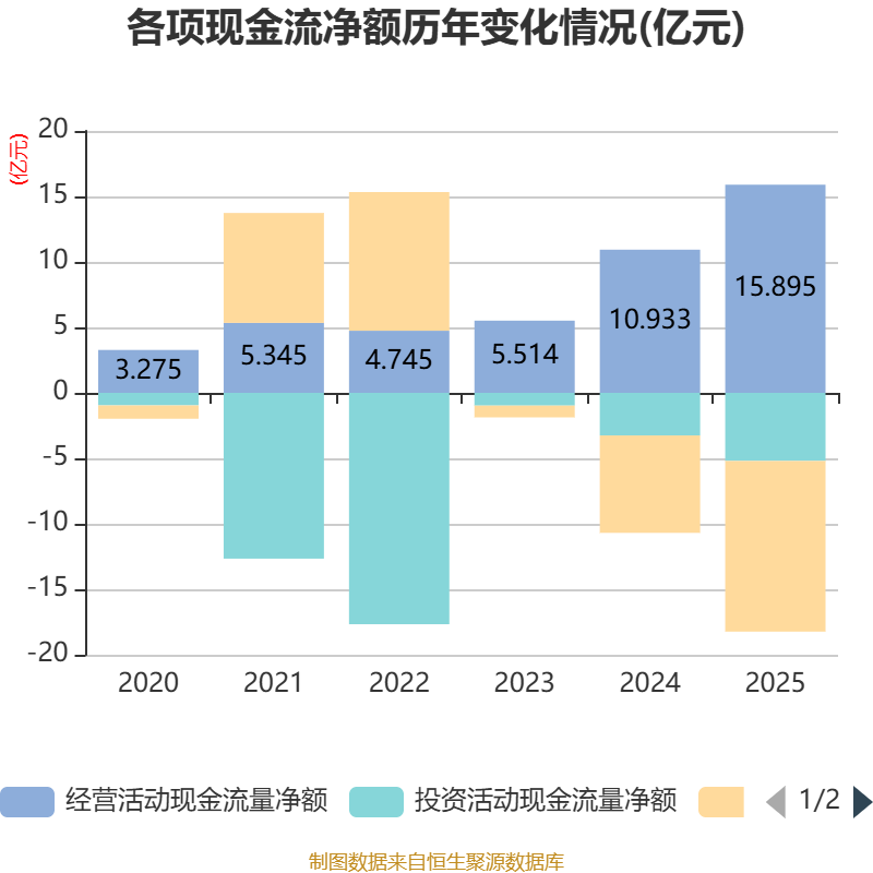 截至2025年,公司经营活动现金流净额为15.89亿元,同比增长45.38%;筹资活动现金流净额-13.04亿元,同比减少5.6亿元;投资活动现金流净额-5.2亿元,上年同期为-3.25亿元。