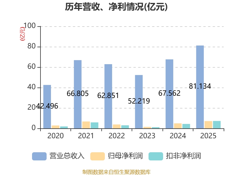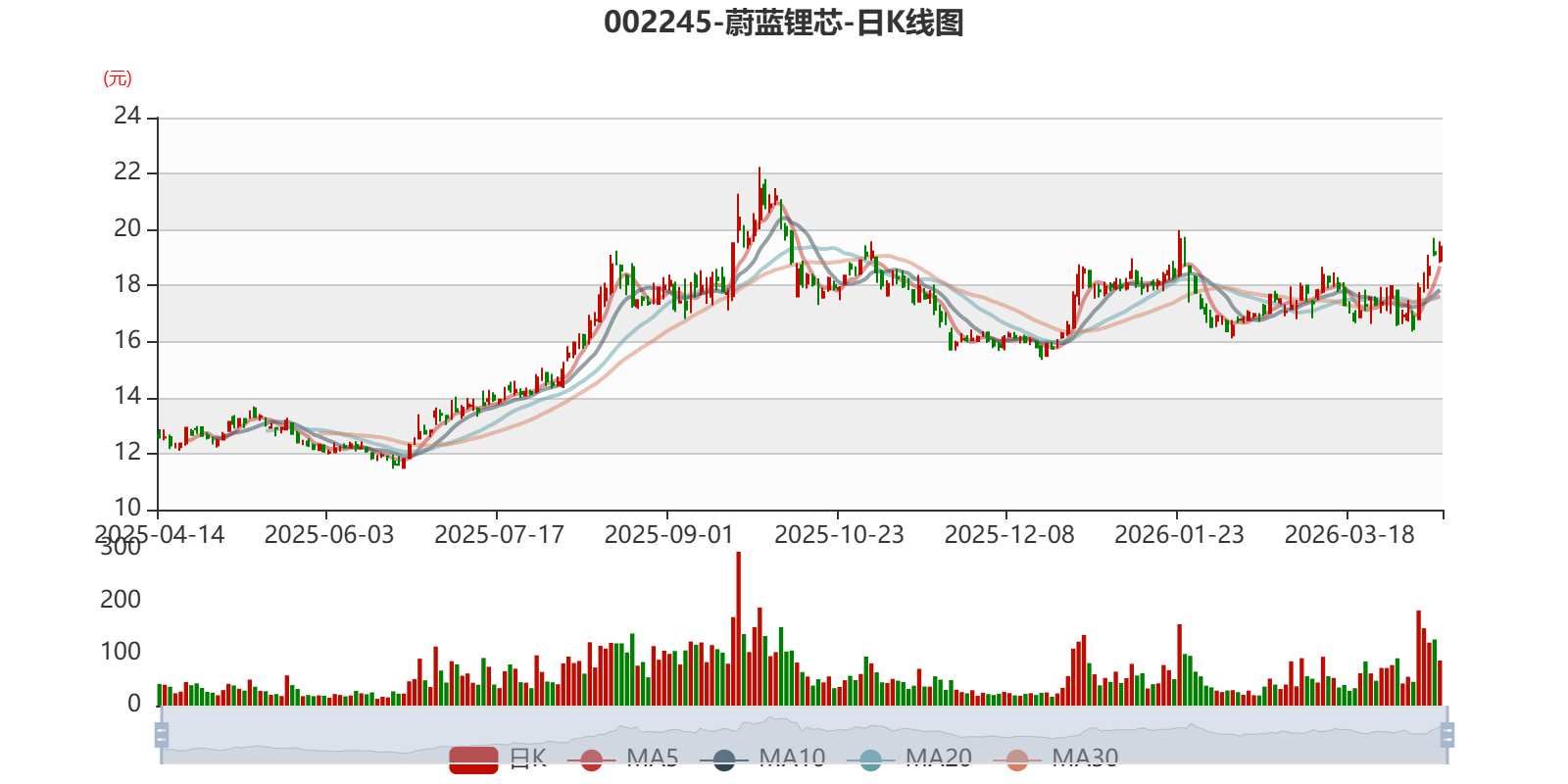 中证智能财讯蔚蓝锂芯(002245)4月14日披露2025年年度报告。2025年,公司实现营业总收入81.13亿元,同比增长20.09%;归母净利润7.11亿元,同比增长45.66%;扣非净利润7.23亿元,同比增长68.40%;经营活动产生的现金流量净额为15.89亿元,同比增长45.38%;报告期内,蔚蓝锂芯基本每股收益为0.6164元,加权平均净资产收益率为9.77%。公司2025年度分配预案为:拟向全体股东每10股转4.8股,派现1元(含税)。