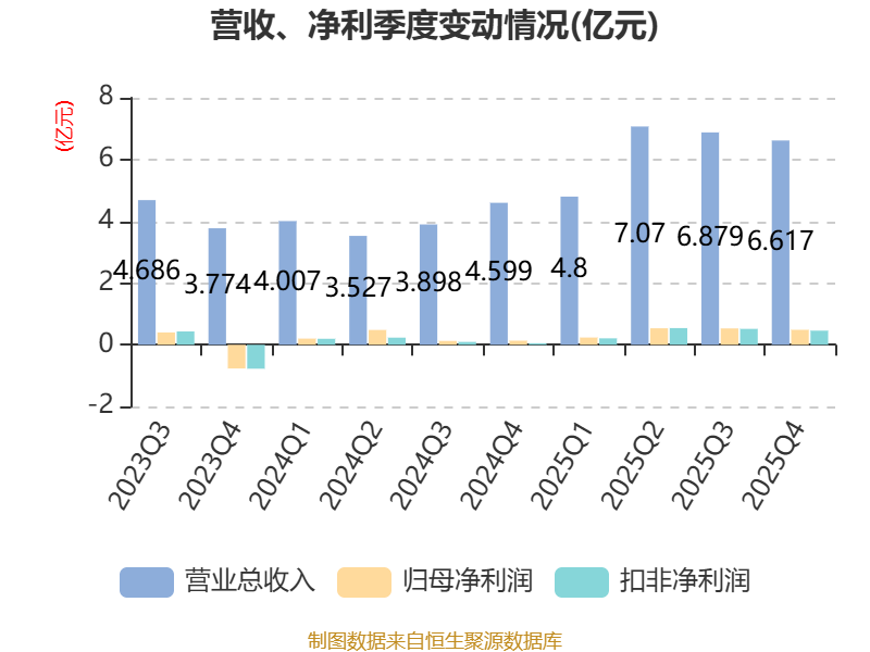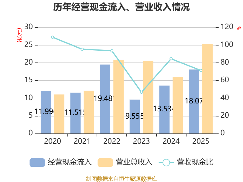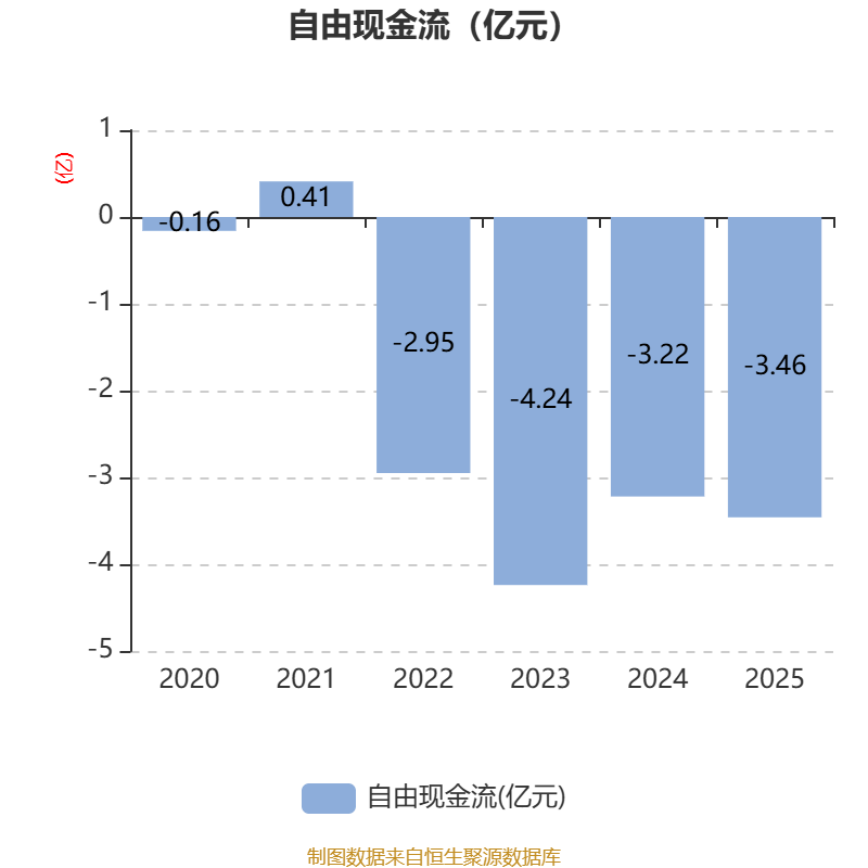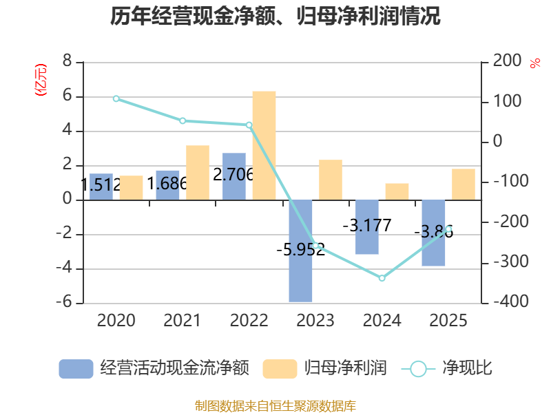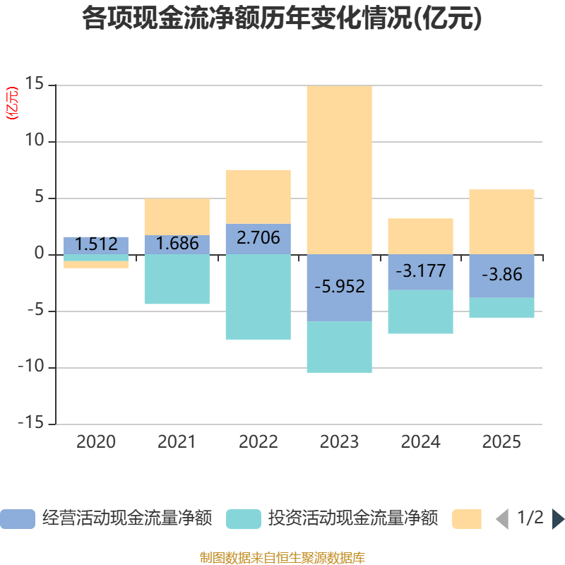 截至2025年,公司经营活动现金流净额为-3.86亿元,同比减少6837.34万元;筹资活动现金流净额5.74亿元,同比增加2.57亿元;投资活动现金流净额-1.75亿元,上年同期为-3.85亿元。