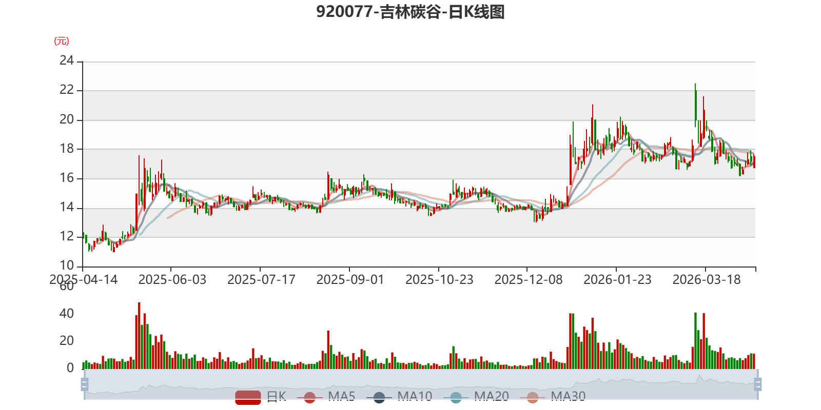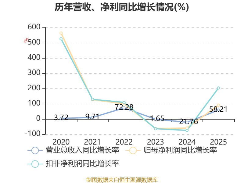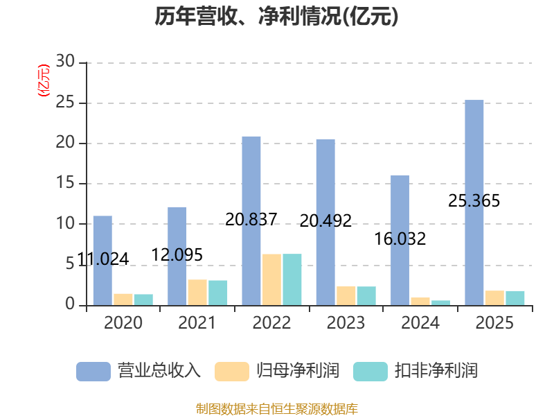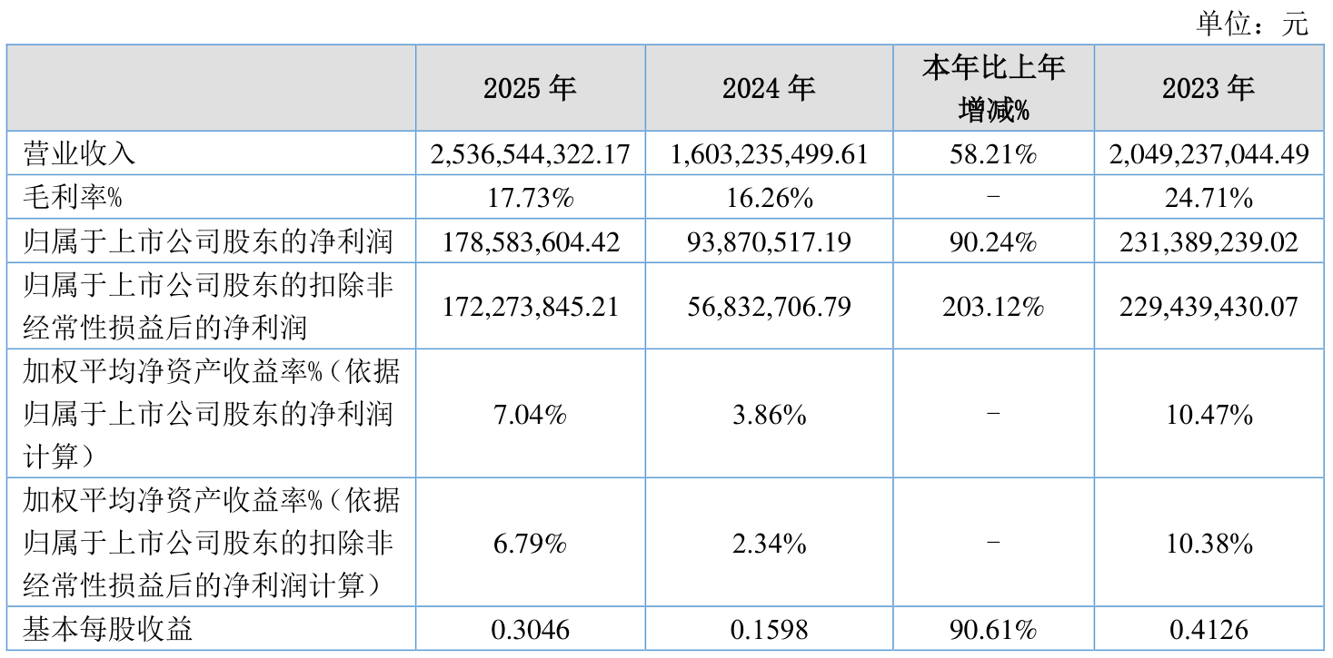 中证智能财讯吉林碳谷(920077)4月13日披露2025年年度报告。2025年,公司实现营业总收入25.37亿元,同比增长58.21%;归母净利润1.79亿元,同比增长90.24%;扣非净利润1.72亿元,同比增长203.12%;经营活动产生的现金流量净额为-3.86亿元,上年同期为-3.18亿元;报告期内,吉林碳谷基本每股收益为0.3046元,加权平均净资产收益率为7.04%。公司2025年度分配预案为:拟向全体股东每10股派现1元(含税)。