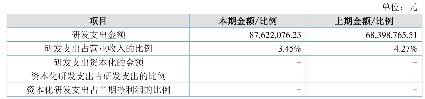 2025年全年,公司研发投入金额为8762.21万元,同比增长28.1%;研发投入占营业收入比例为3.45%,相比上年同期下降0.82个百分点。