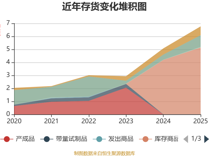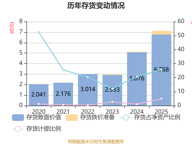 从存货变动来看,截至2025年末,公司存货账面价值为6.77亿元,占净资产的25.75%,较上年末增加1.69亿元。其中,存货跌价准备为3550.35万元,计提比例为4.98%。
