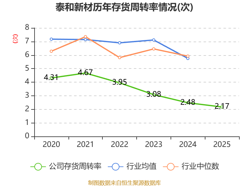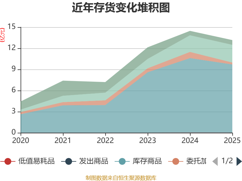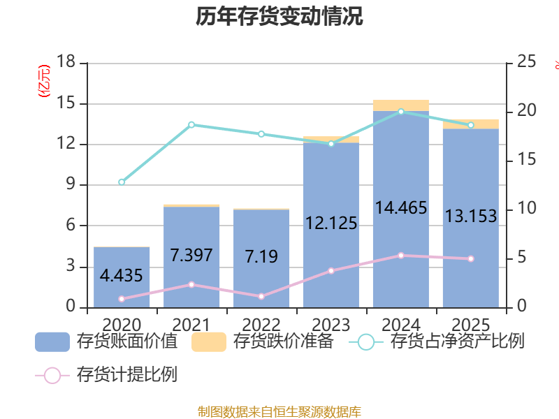 从存货变动来看,截至2025年末,公司存货账面价值为13.15亿元,占净资产的18.63%,较上年末减少1.31亿元。其中,存货跌价准备为6858.29万元,计提比例为4.96%。