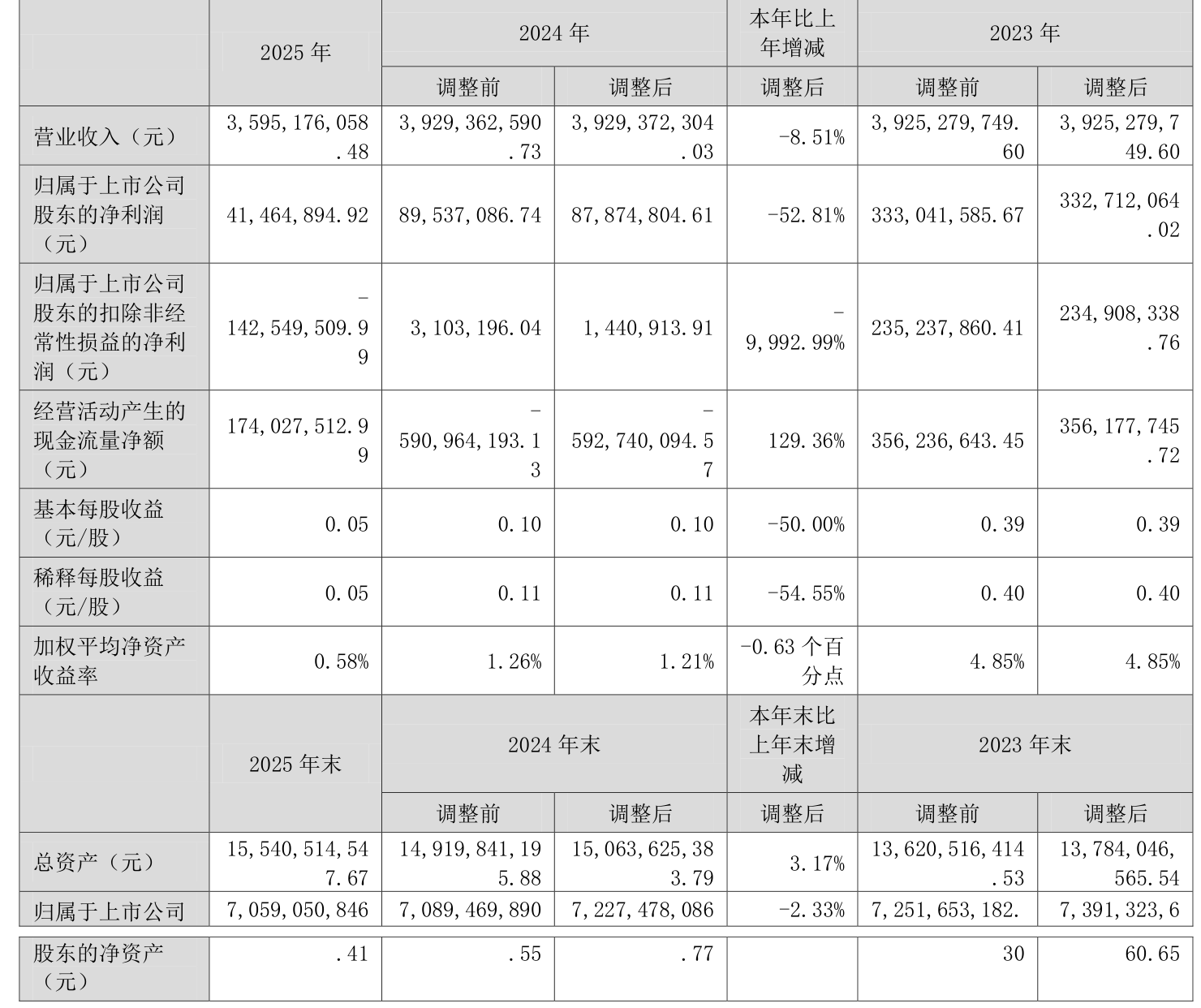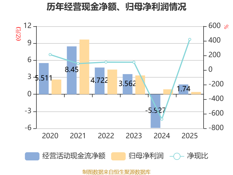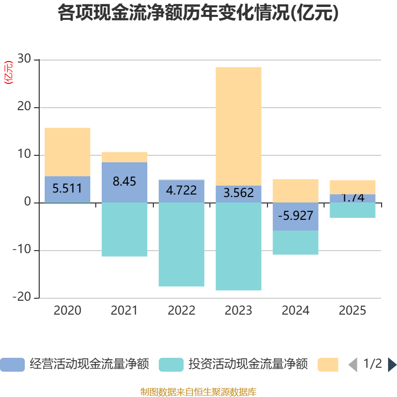 截至2025年,公司经营活动现金流净额为1.74亿元,同比增加7.67亿元;筹资活动现金流净额2.93亿元,同比减少1.96亿元;投资活动现金流净额-3.23亿元,上年同期为-5.02亿元。
