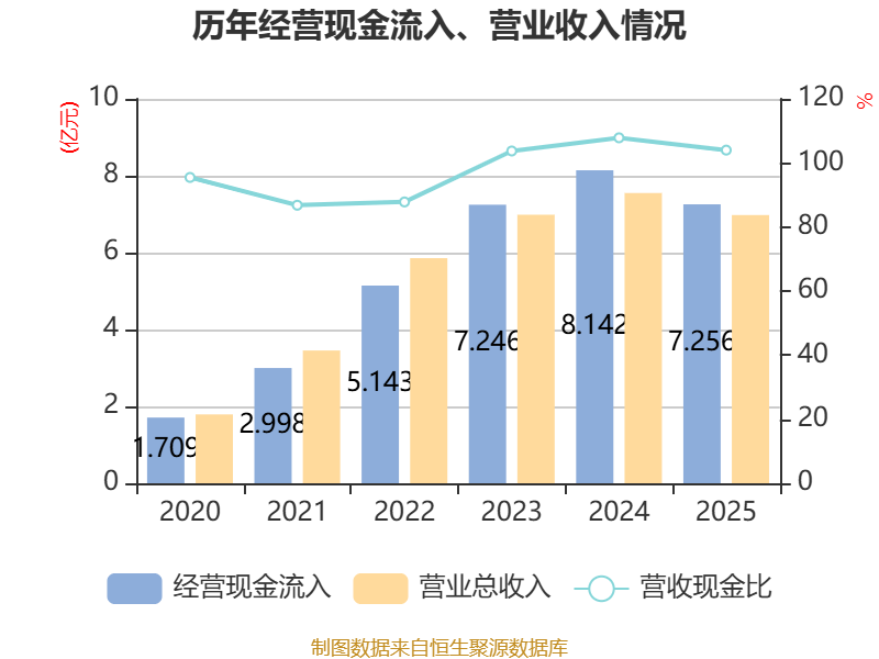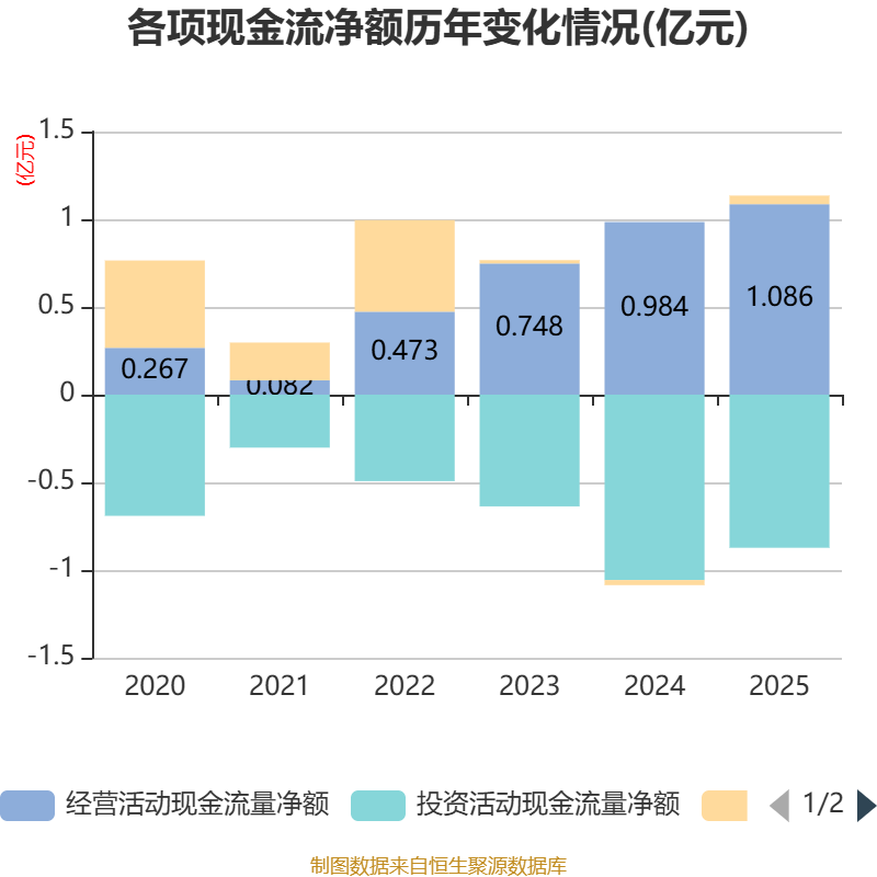 截至2025年,公司经营活动现金流净额为1.09亿元,同比增长10.35%;筹资活动现金流净额491.64万元,同比增加785.18万元;投资活动现金流净额-8728.16万元,上年同期为-1.06亿元。