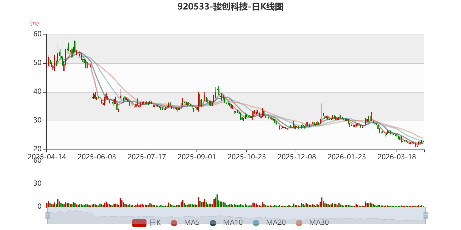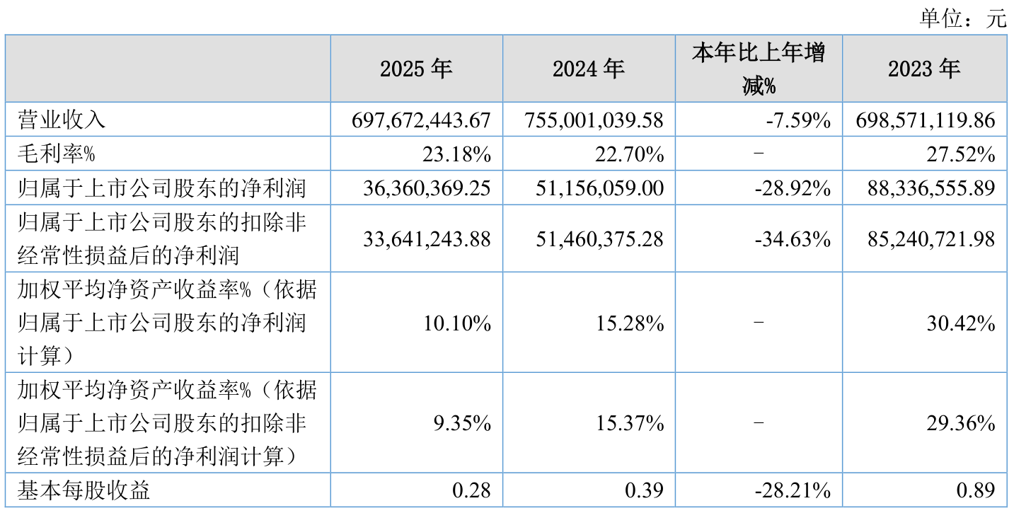 中证智能财讯骏创科技(920533)4月13日披露2025年年度报告。2025年,公司实现营业总收入6.98亿元,同比下降7.59%;归母净利润3636.04万元,同比下降28.92%;扣非净利润3364.12万元,同比下降34.63%;经营活动产生的现金流量净额为1.09亿元,同比增长10.35%;报告期内,骏创科技基本每股收益为0.28元,加权平均净资产收益率为10.10%。公司2025年度分配预案为:拟向全体股东每10股派现1元(含税)。