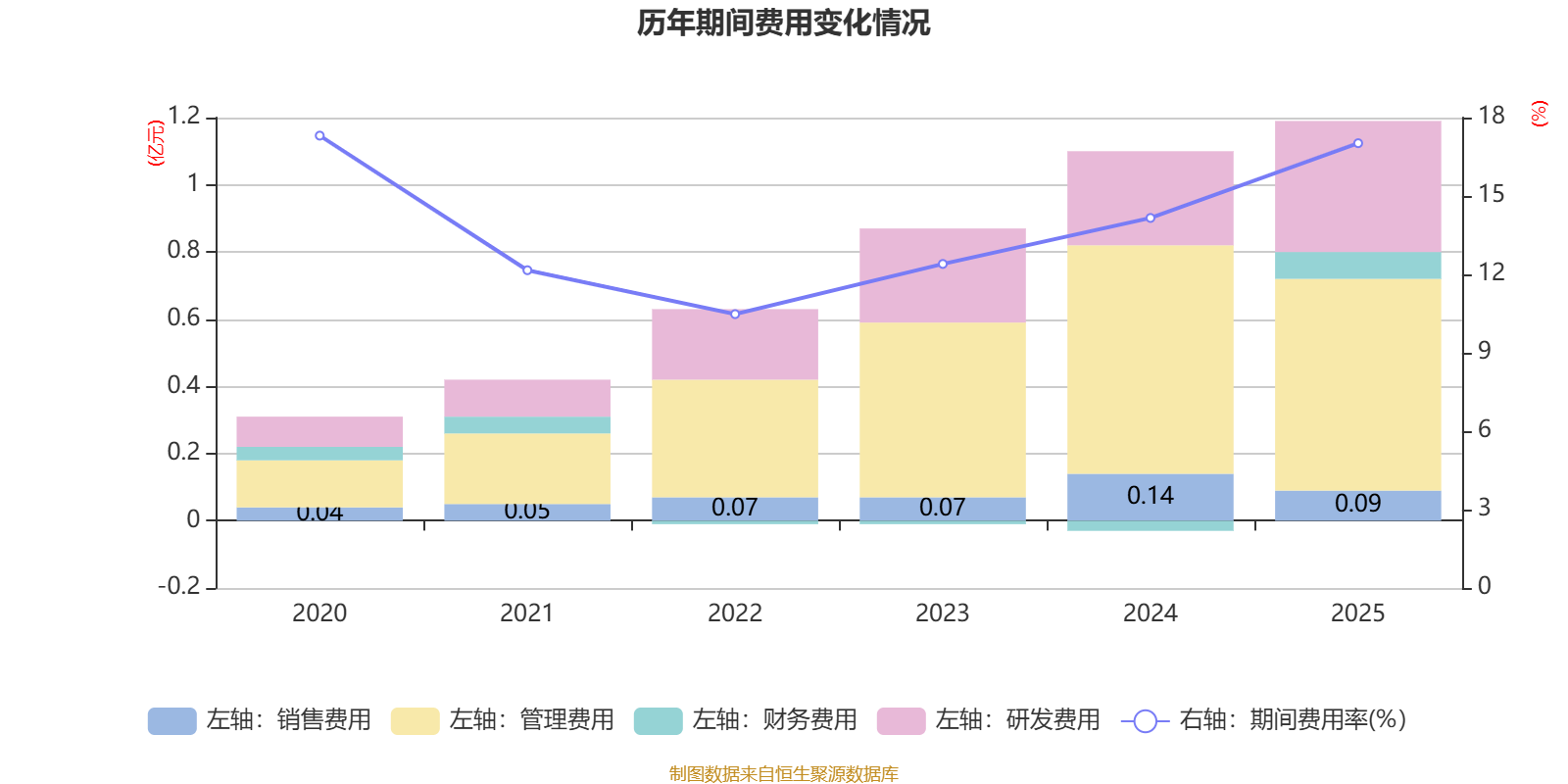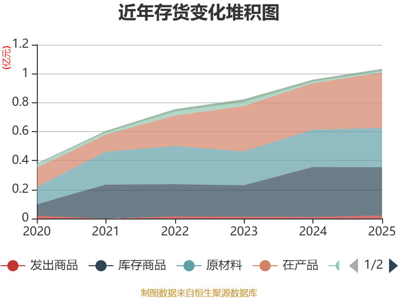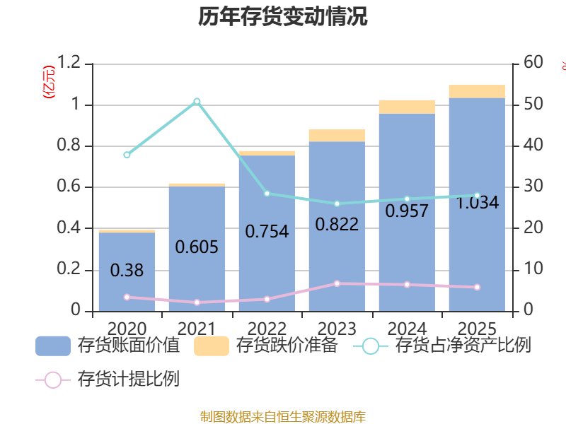 从存货变动来看,截至2025年末,公司存货账面价值为1.03亿元,占净资产的28.01%,较上年末增加767.2万元。其中,存货跌价准备为631.21万元,计提比例为5.76%。