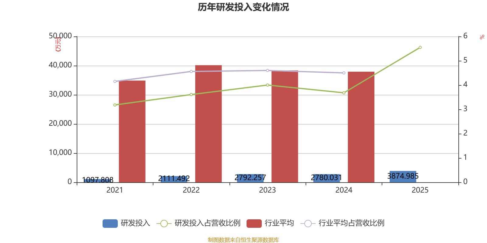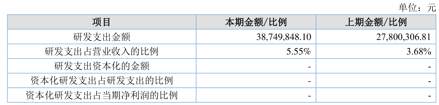 2025年全年,公司研发投入金额为3874.98万元,同比增长39.39%;研发投入占营业收入比例为5.55%,相比上年同期上升1.87个百分点。