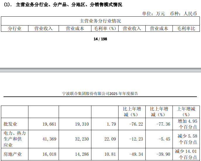 回到公司2025年年报上来。年报显示,本报告期,宁波联合营业收入12.68亿元,营业成本11.23亿元,分别完成年度经营计划的63.4%和61.9%,主要系进口煤炭销售量低于预期,致使营业收入和营业成本的实绩共同低于计划;费用总额1.30亿元,完成年度经营计划的74.7%,主要系财务费用的实绩低于计划所致,低于计划的主要原因是子公司温州银联公司及温州和晟公司将本报告期销售存量房产生的净现金用于偿还较多借款致使利息支出减少。本年度业绩略高于上年同期。