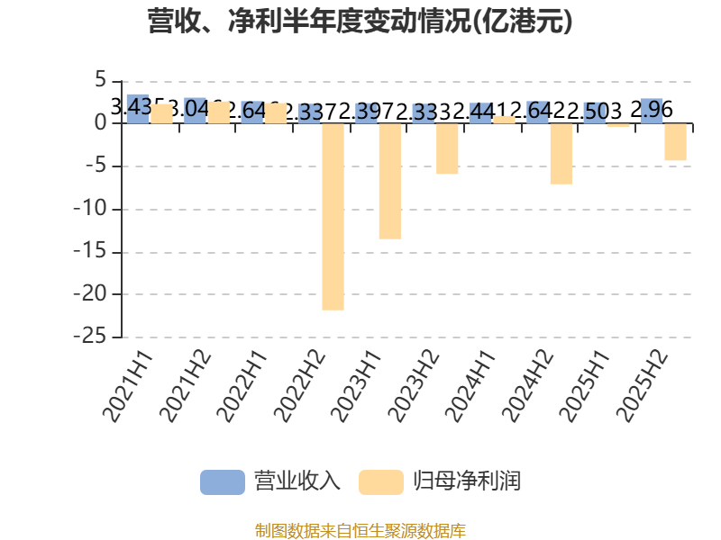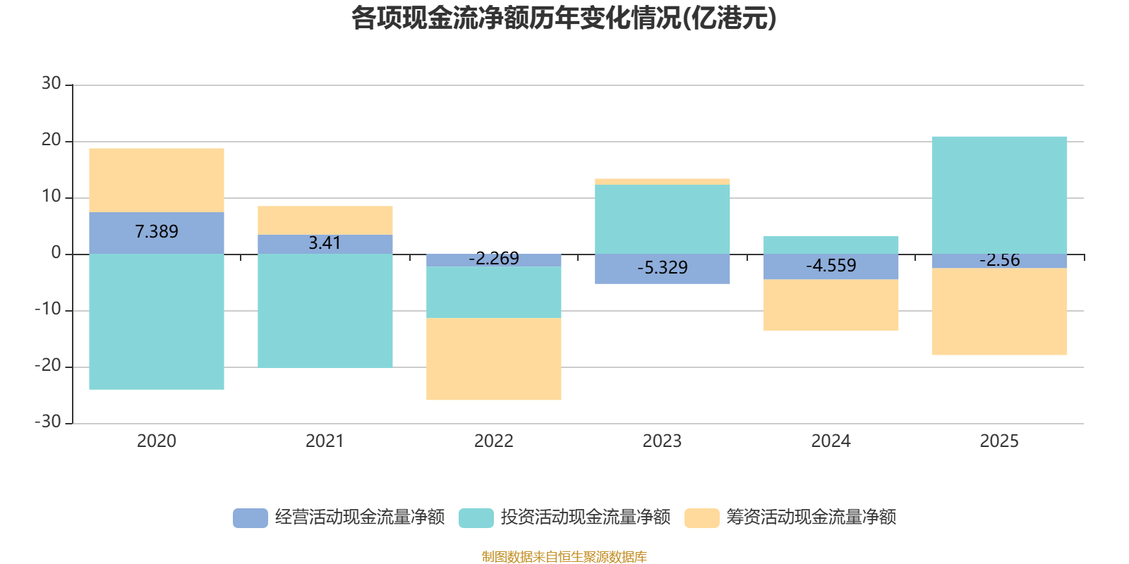 2025年,公司经营活动现金流净额为-2.56亿港元,同比增加2亿港元;筹资活动现金流净额-15.37亿港元,同比减少6.31亿港元;投资活动现金流净额20.79亿港元,上年同期为3.13亿港元。
