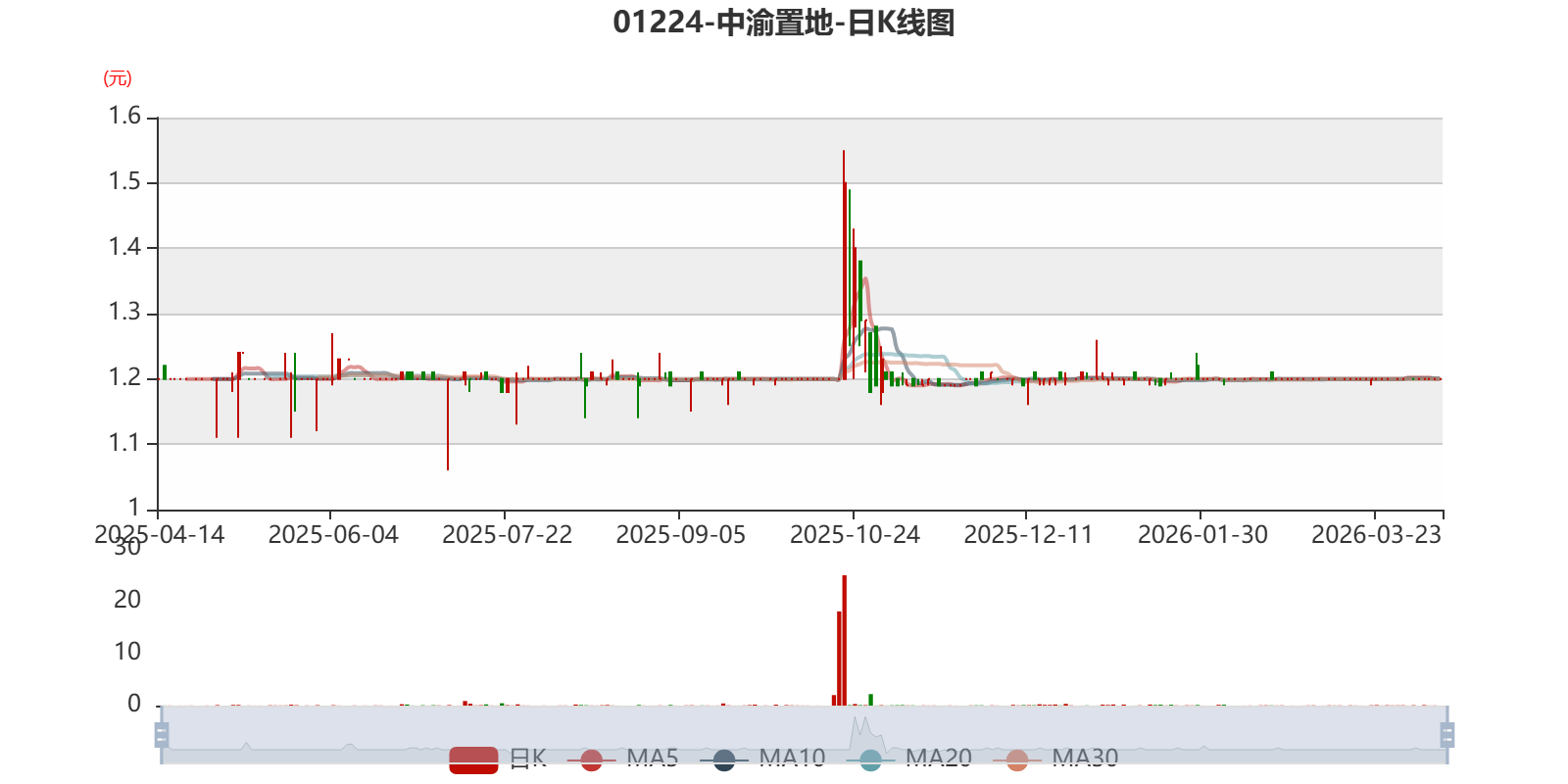 中证智能财讯中渝置地(01224)4月13日披露2025年度报告。报告期内,公司实现营业收入5.46亿港元,同比增长7.47%;归母净利润亏损4.67亿港元,上年同期亏损6.18亿港元;经营活动产生的现金流量净额为-2.56亿港元,上年同期为-4.56亿港元;据报告显示,中渝置地基本每股收益为-0.1202港元,平均净资产收益率为-3.62%。