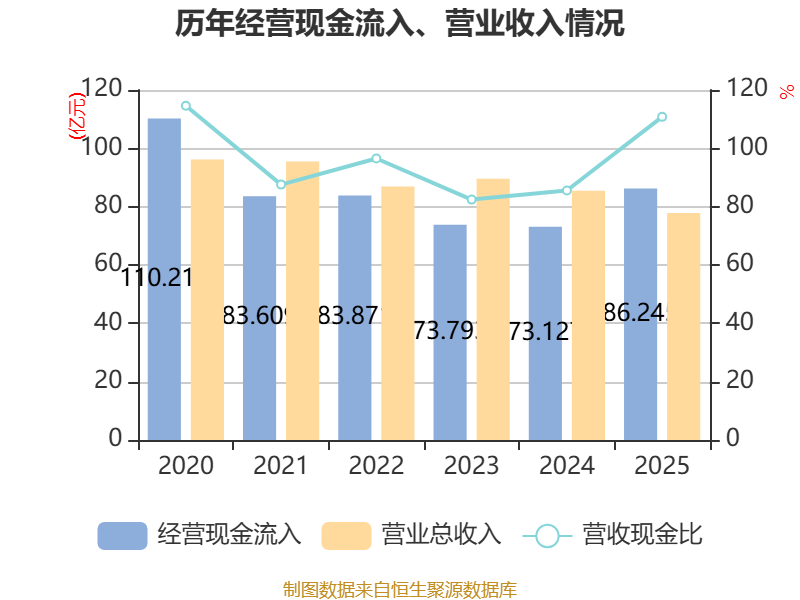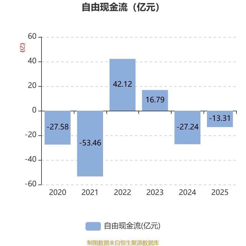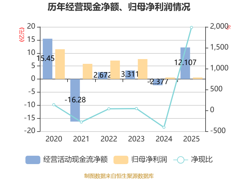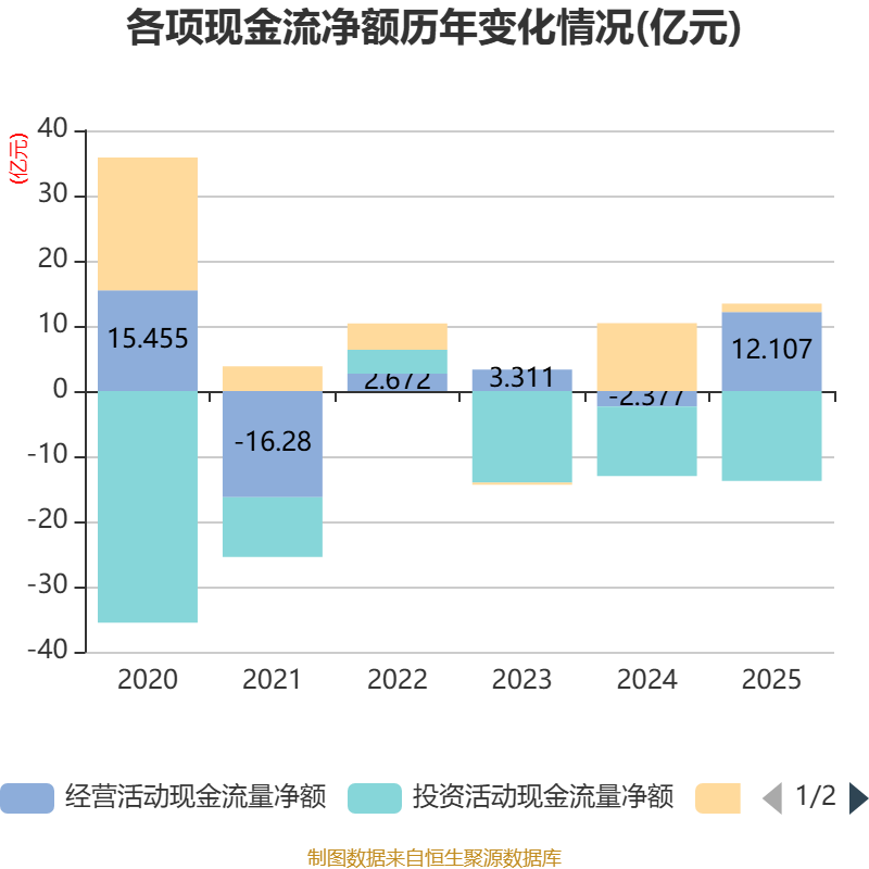 截至2025年,公司经营活动现金流净额为12.11亿元,同比增加14.48亿元;筹资活动现金流净额1.31亿元,同比减少9.13亿元;投资活动现金流净额-13.79亿元,上年同期为-10.66亿元。